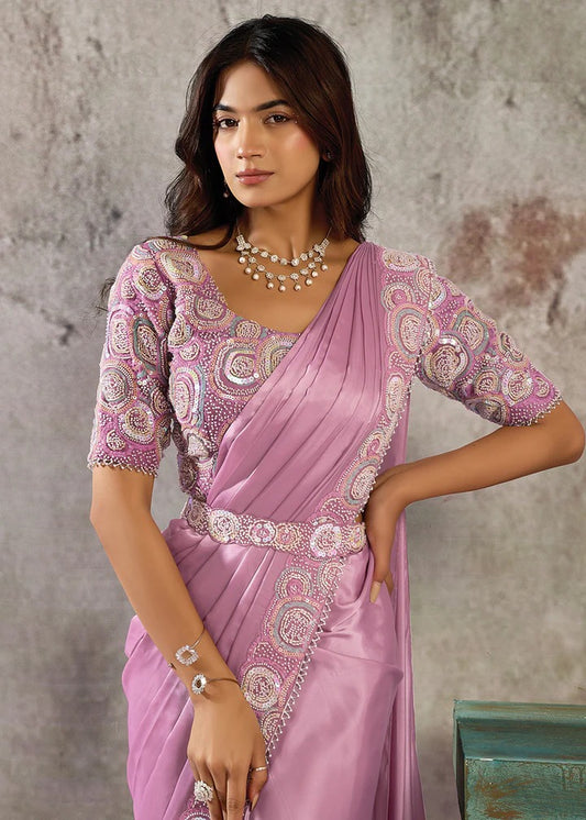 Lavender Satin Pre-Stitched Saree with Belt – Elegant & Easy to Wear