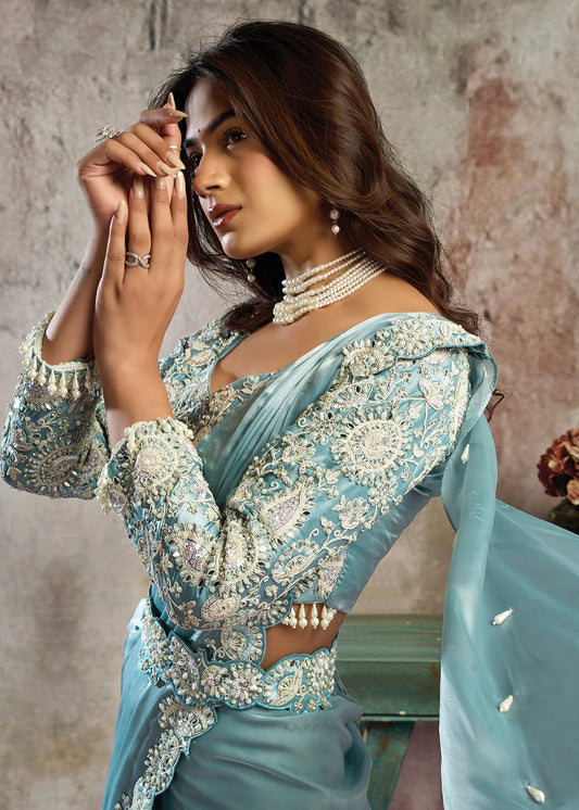 Mint Blue Satin Pre-Stitched Saree with Belt – Elegant & Easy to Wear