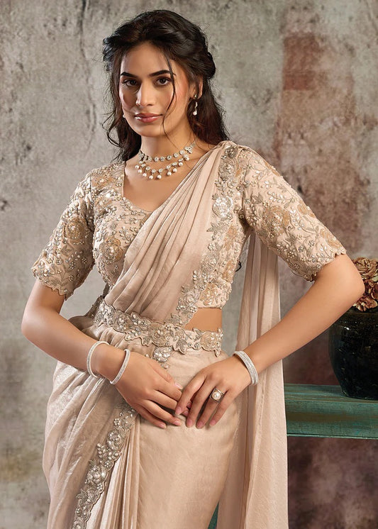 Beige Satin Pre-Stitched Saree with Belt – Elegant & Easy to Wear