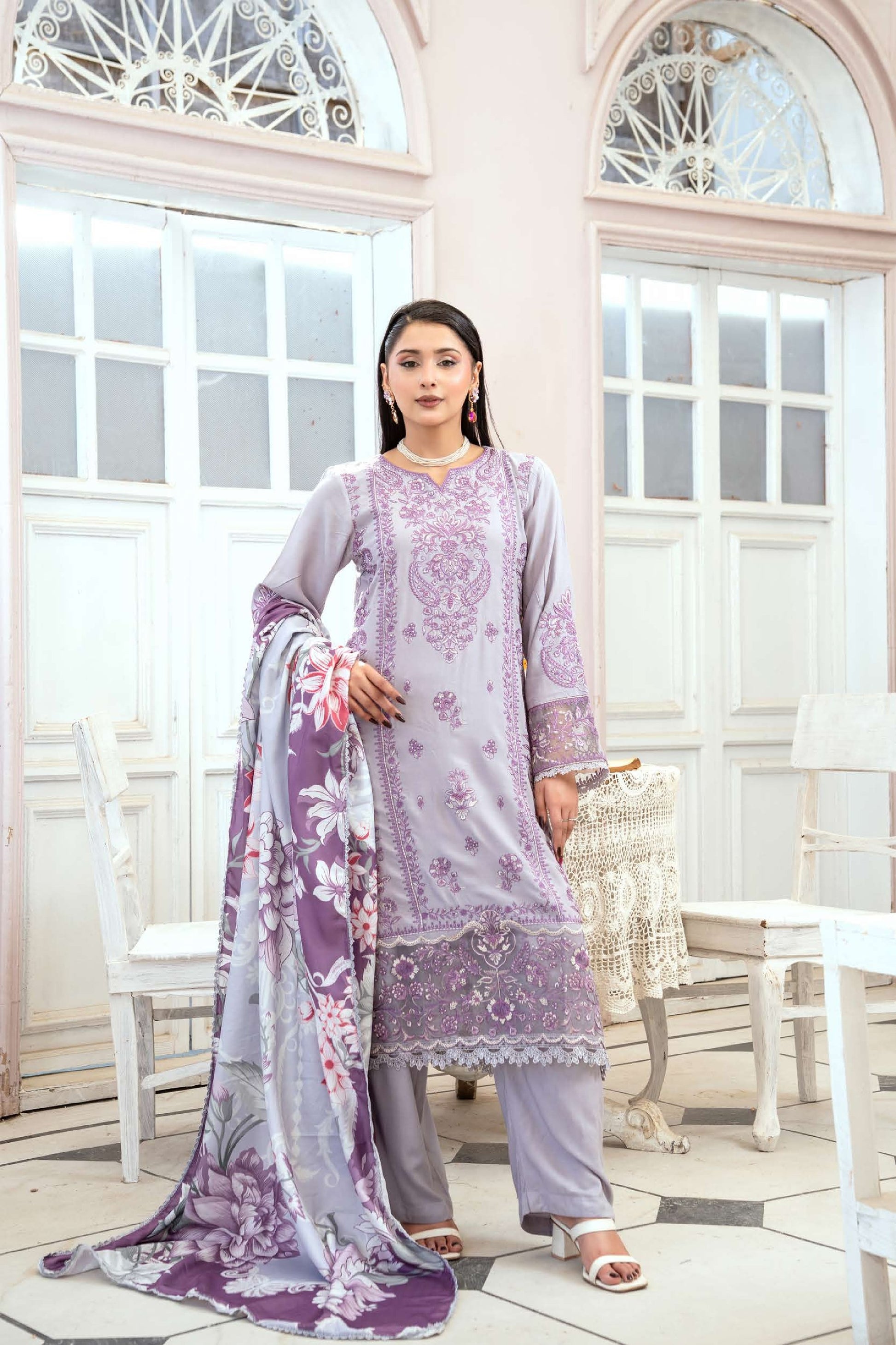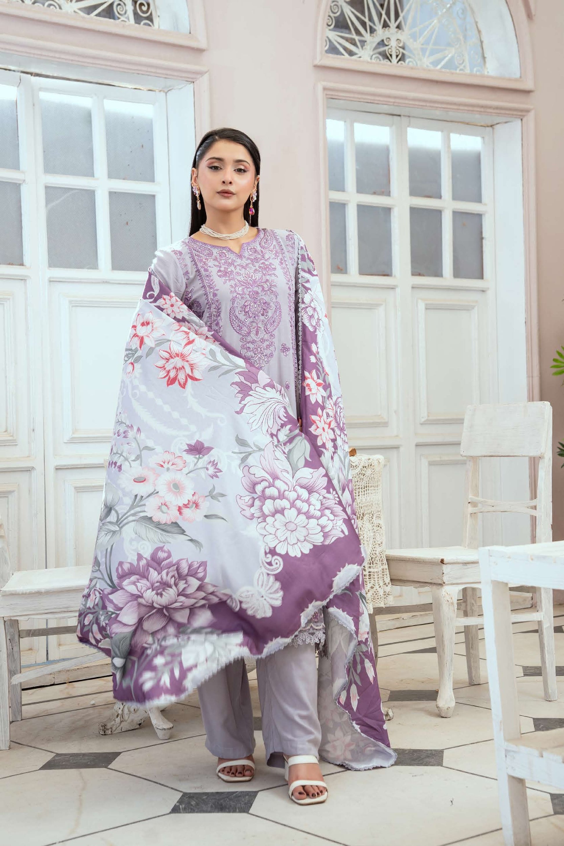 Elegantes 3-teiliges Linen-Set – Bestickt & mit Woll-Schal