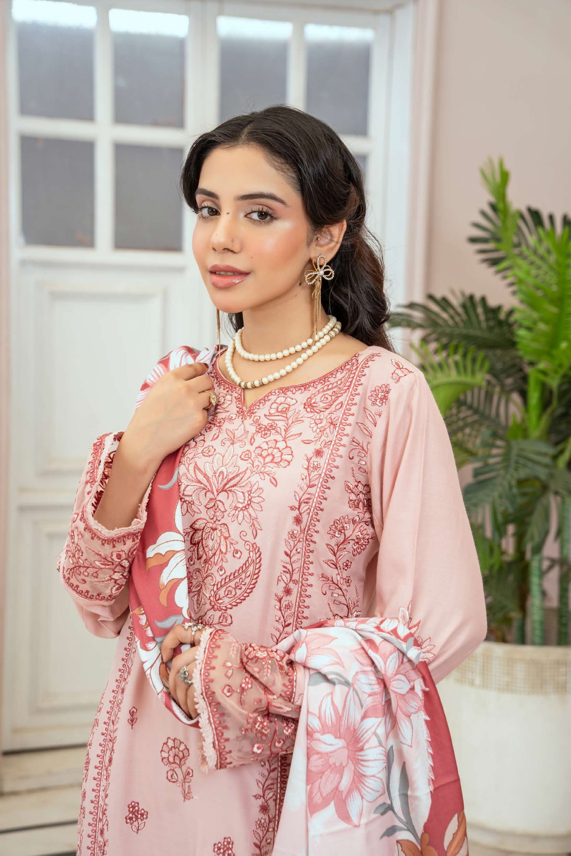 Elegantes 3-teiliges Linen-Set – Bestickt & mit Woll-Schal