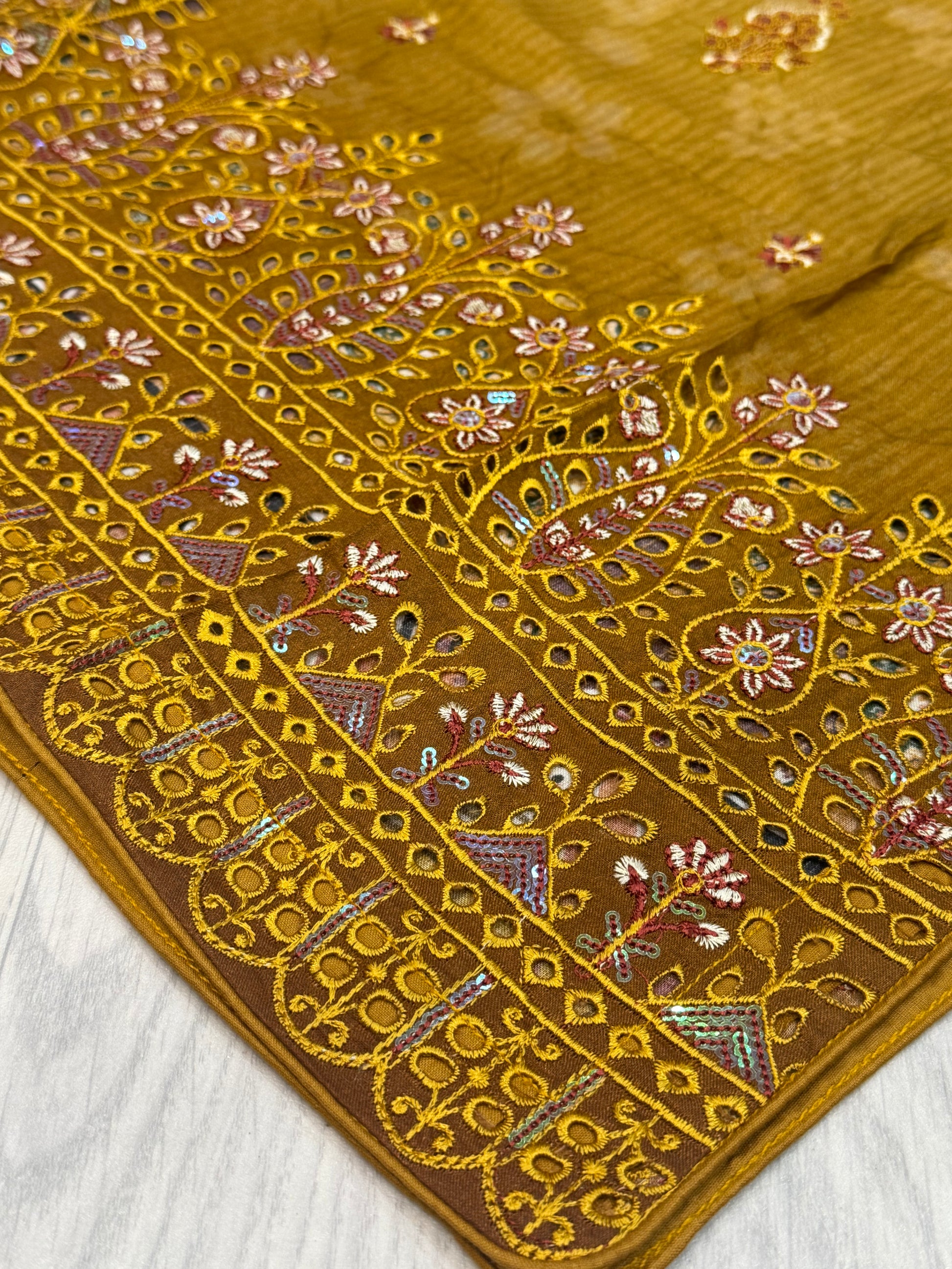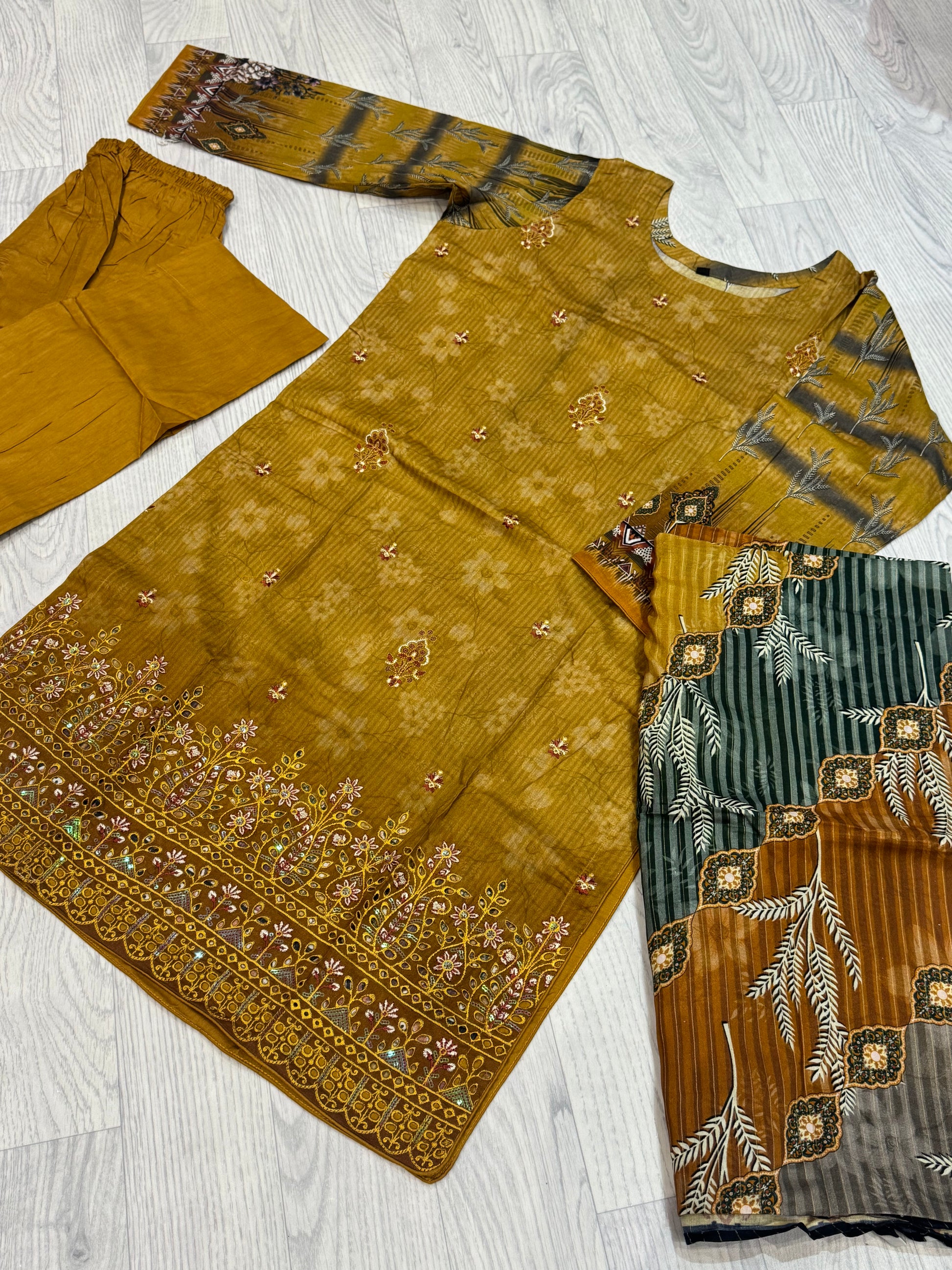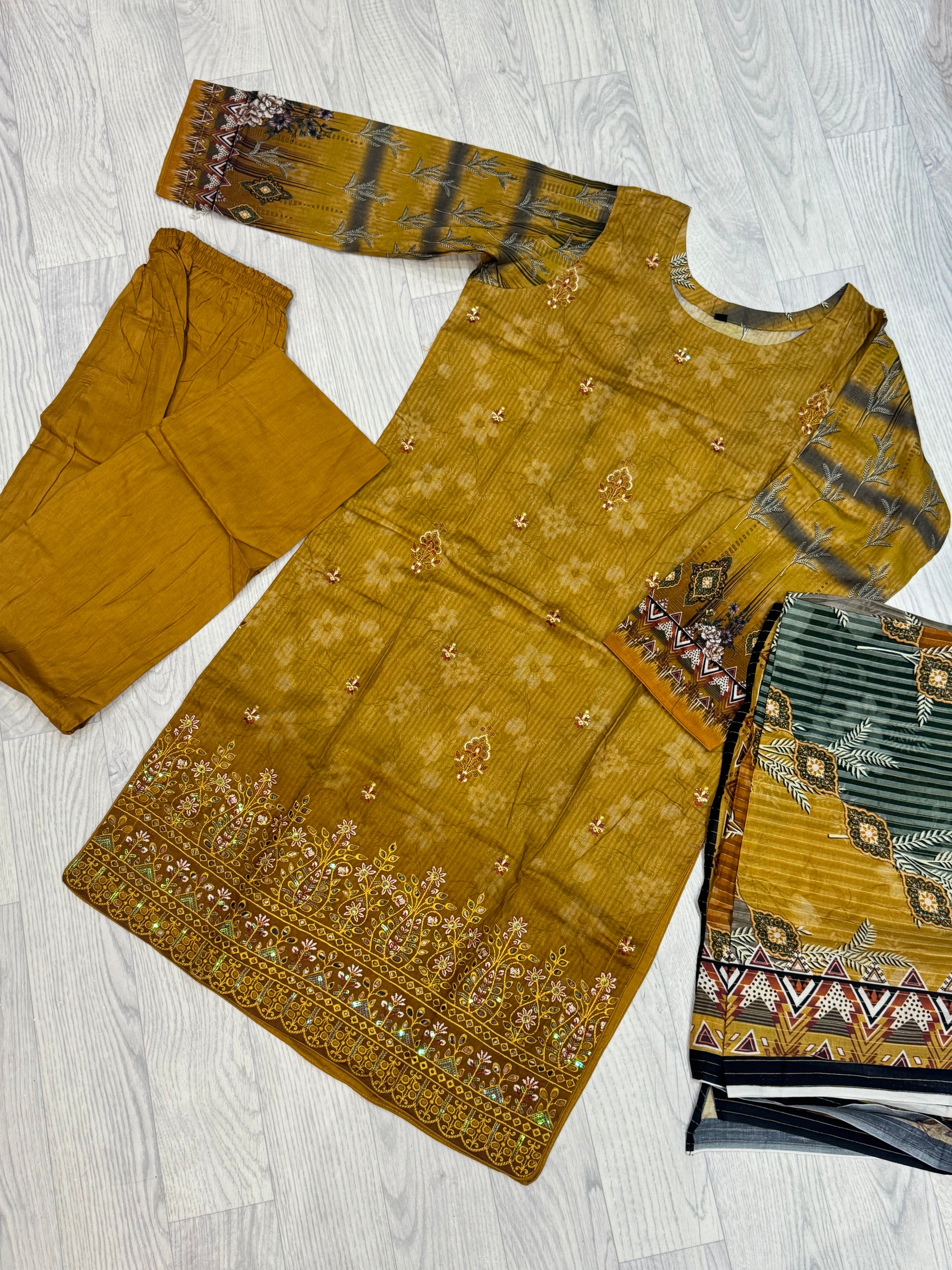Der Kameez ist mit feinen Pailletten-Applikationen (Sequins Work) verziert, die dem schlichten Design einen dezenten Glamour verleihen, ohne dabei aufdringlich zu wirken. Die locker geschnittene Hose bietet Bewegungsfreiheit und Komfort, während die leichte Schaal den Look stilvoll abrundet.