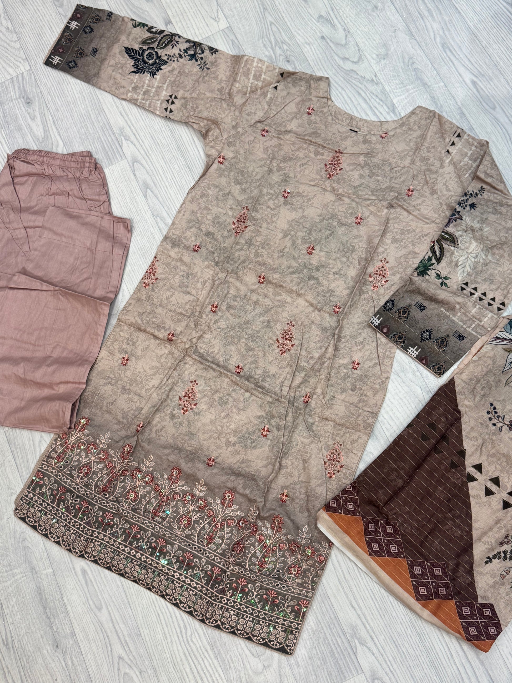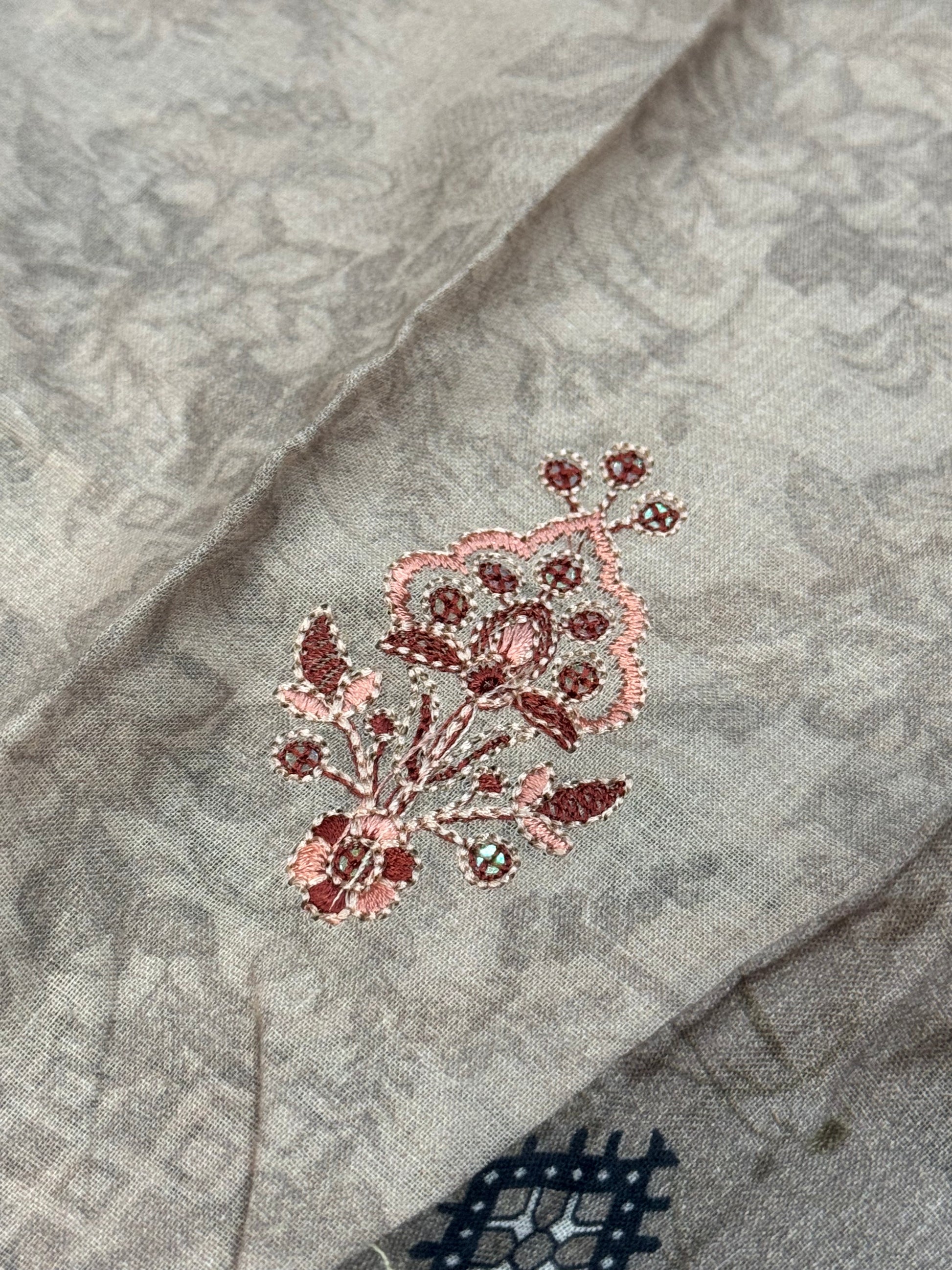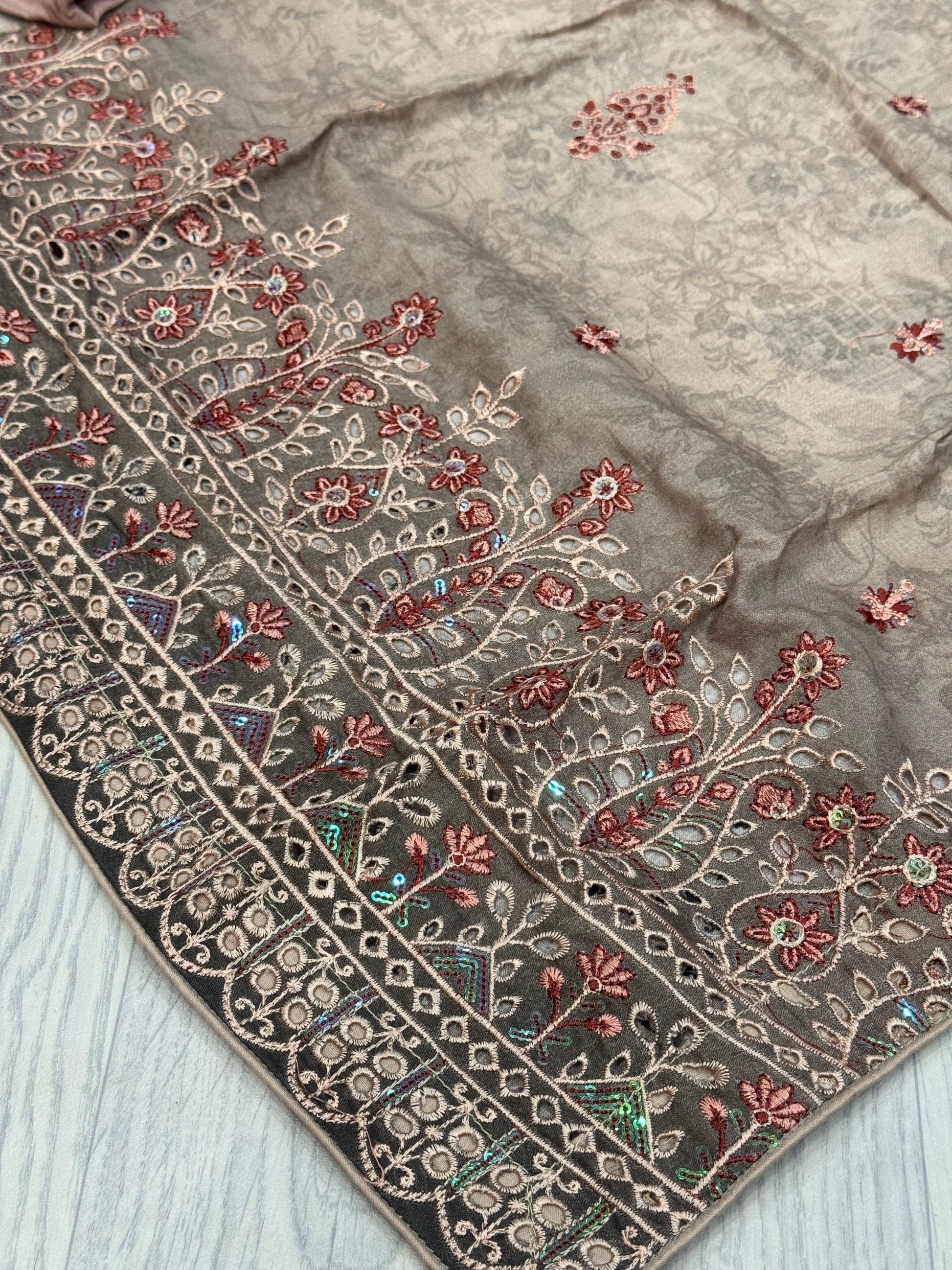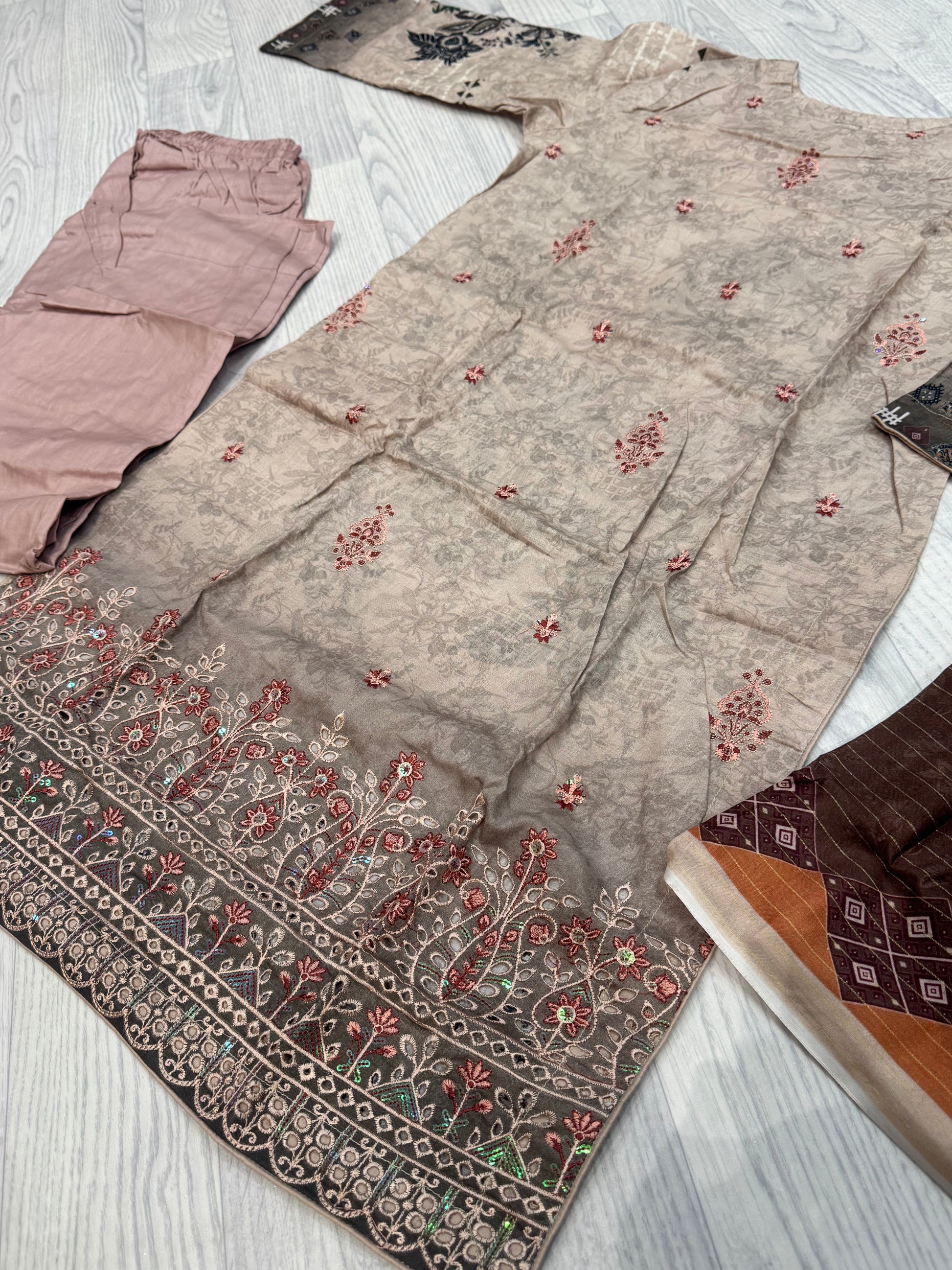 Der Kameez ist mit feinen Pailletten-Applikationen (Sequins Work) verziert, die dem schlichten Design einen dezenten Glamour verleihen, ohne dabei aufdringlich zu wirken. Die locker geschnittene Hose bietet Bewegungsfreiheit und Komfort, während die leichte Schaal den Look stilvoll abrundet.