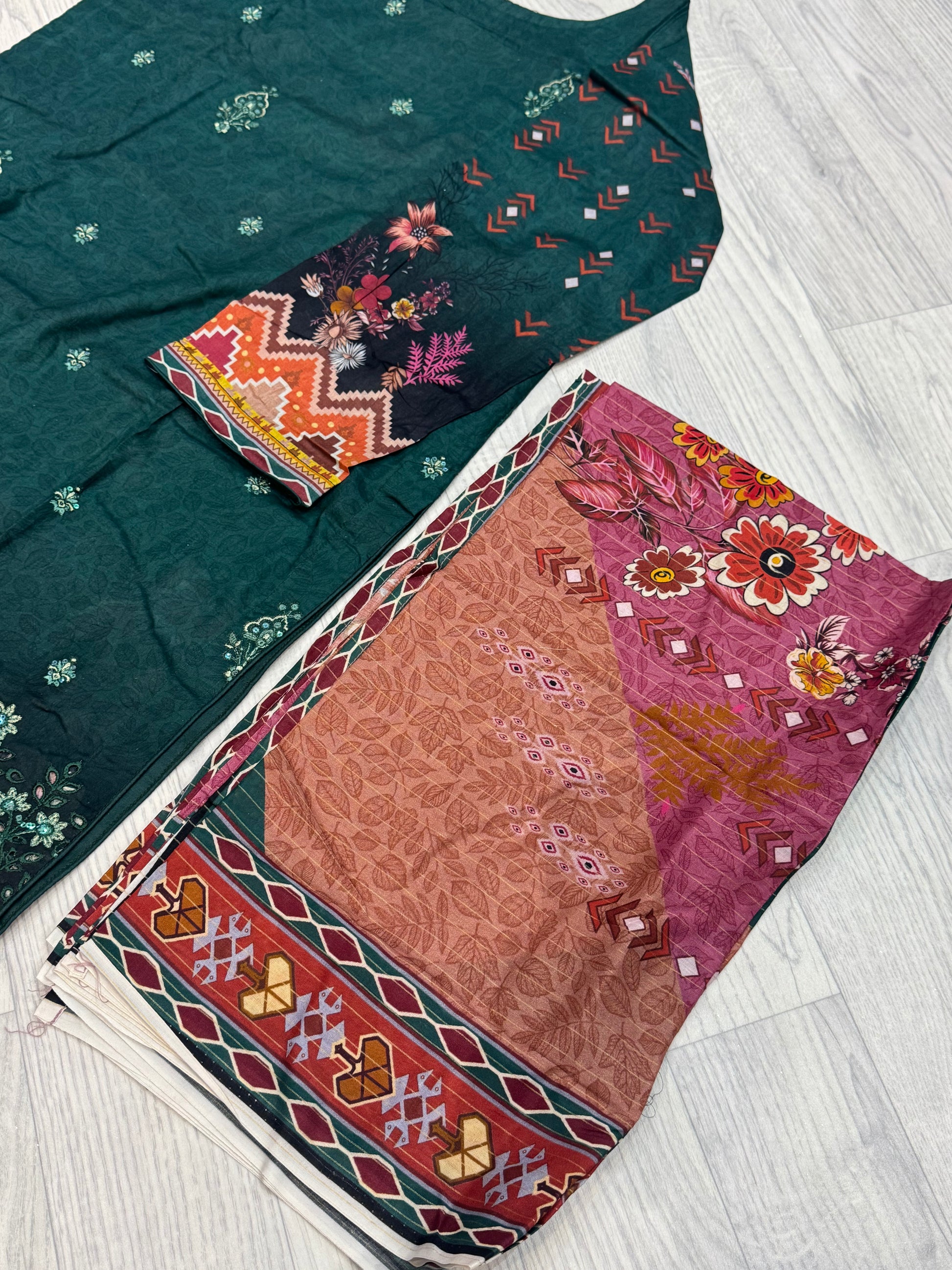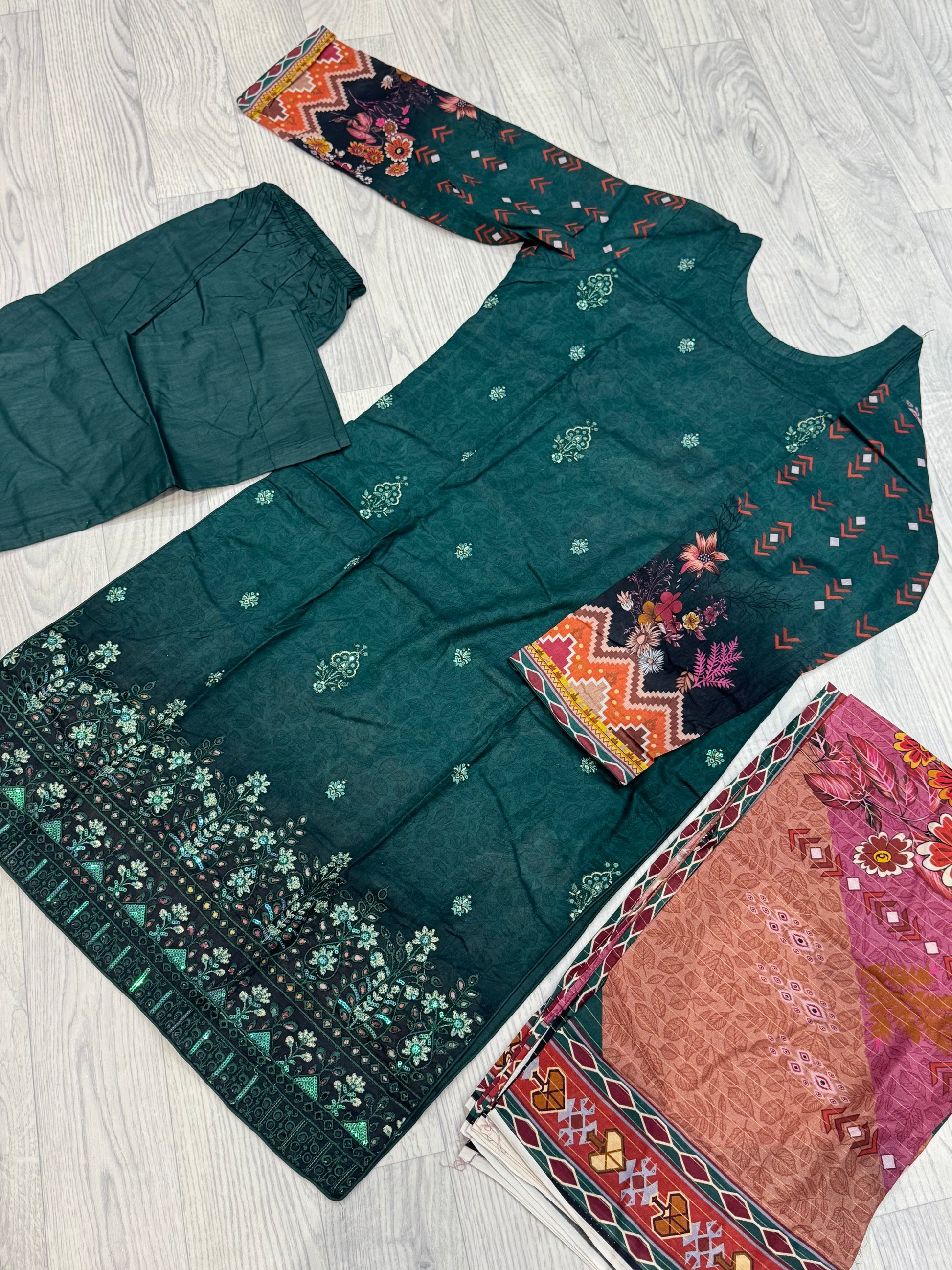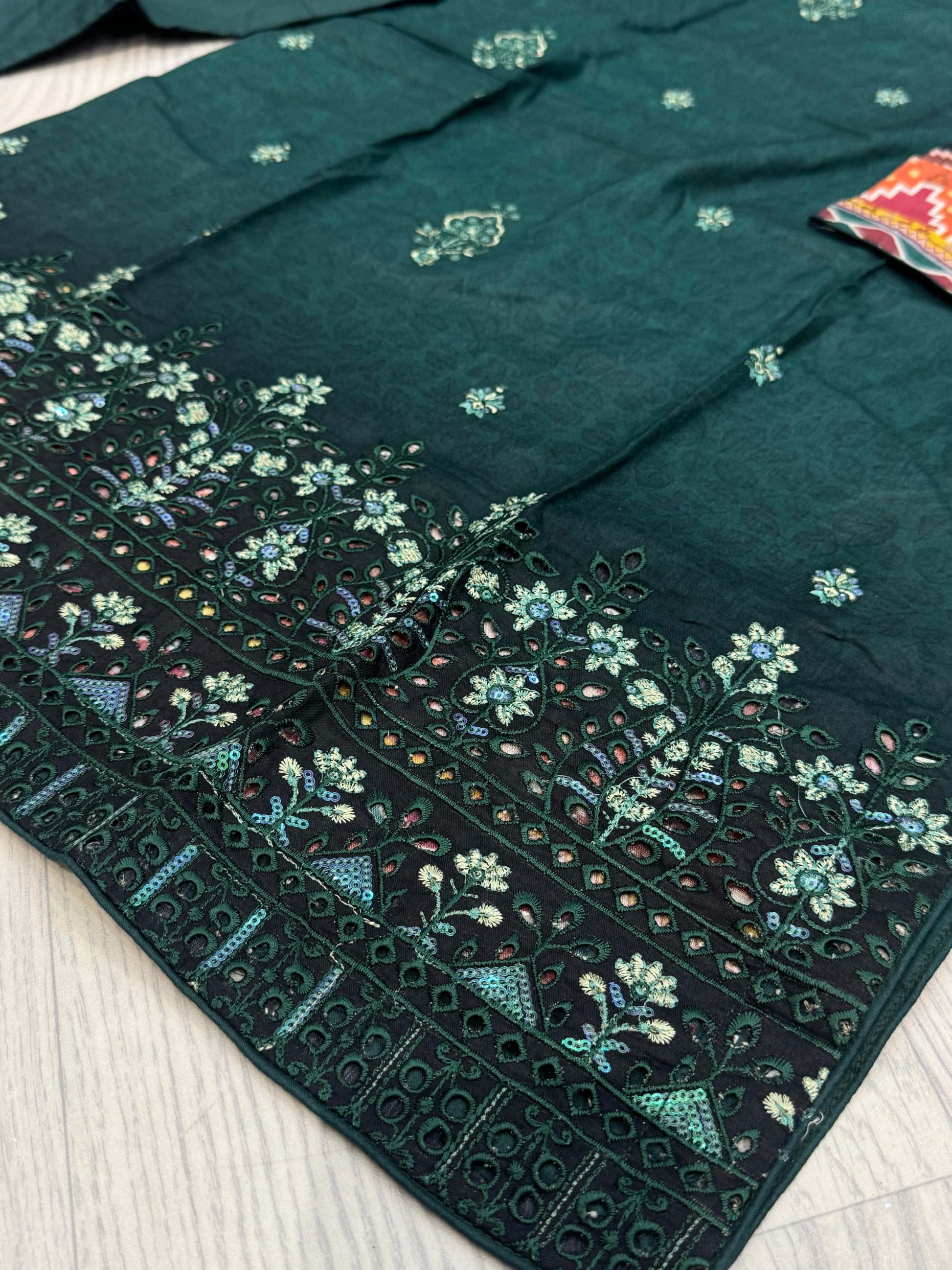 Der Kameez ist mit feinen Pailletten-Applikationen (Sequins Work) verziert, die dem schlichten Design einen dezenten Glamour verleihen, ohne dabei aufdringlich zu wirken. Die locker geschnittene Hose bietet Bewegungsfreiheit und Komfort, während die leichte Schaal den Look stilvoll abrundet.