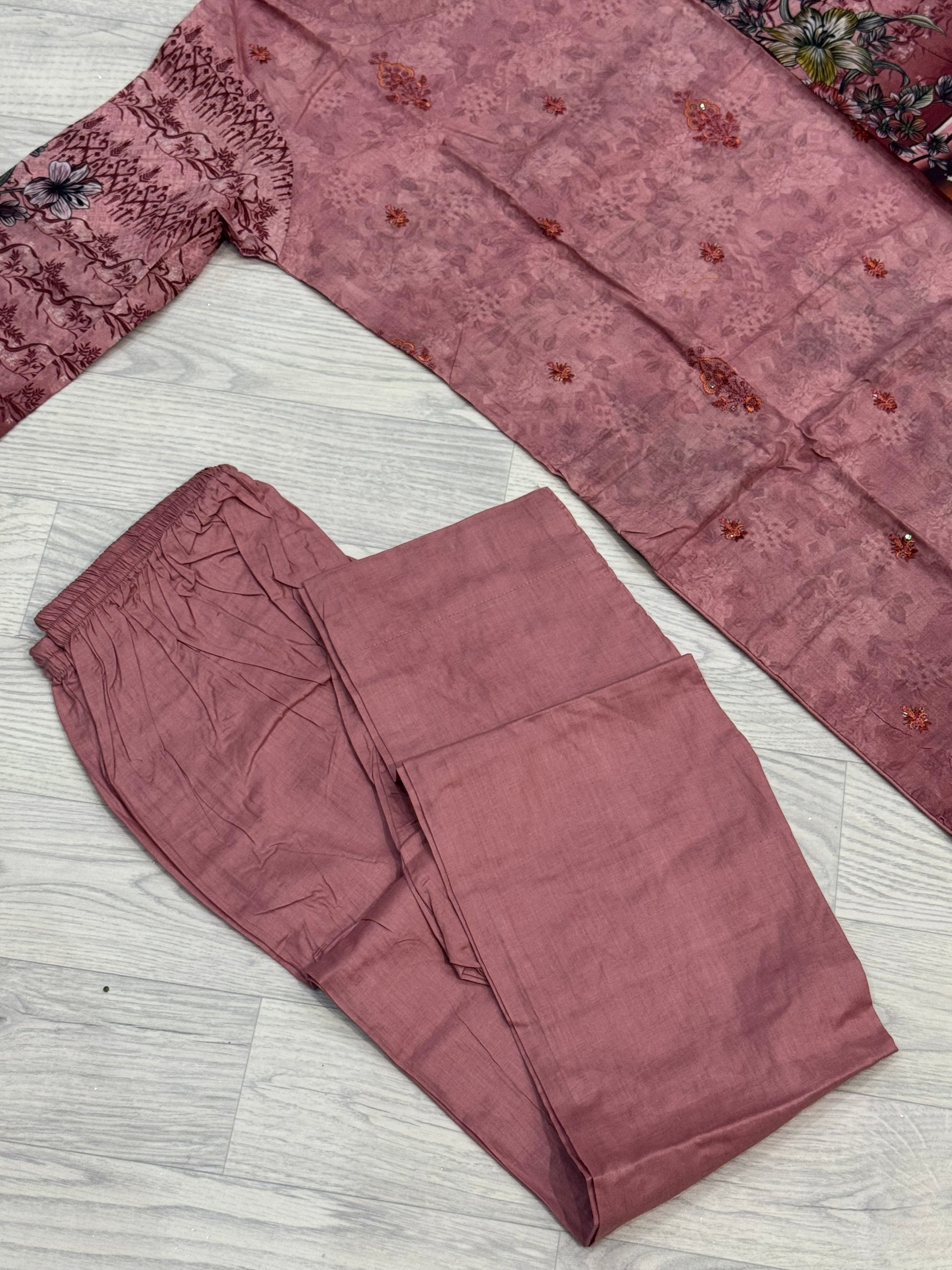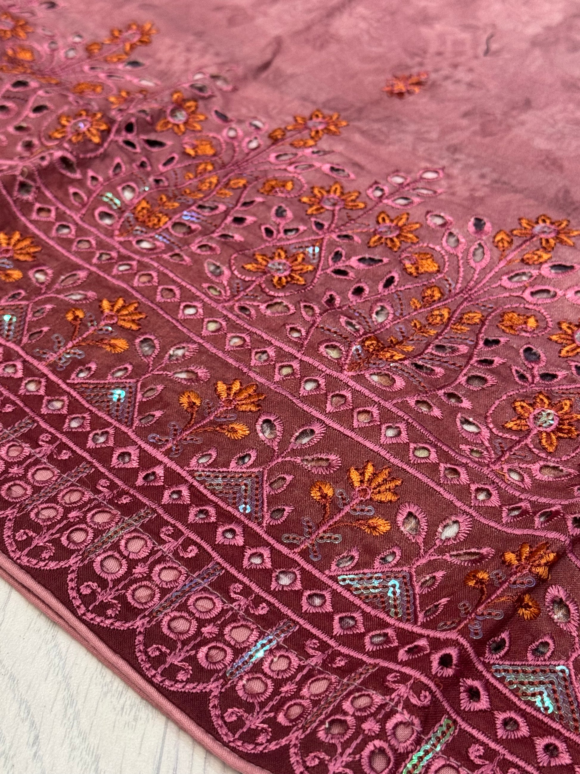 Der Kameez ist mit feinen Pailletten-Applikationen (Sequins Work) verziert, die dem schlichten Design einen dezenten Glamour verleihen, ohne dabei aufdringlich zu wirken. Die locker geschnittene Hose bietet Bewegungsfreiheit und Komfort, während die leichte Schaal den Look stilvoll abrundet.