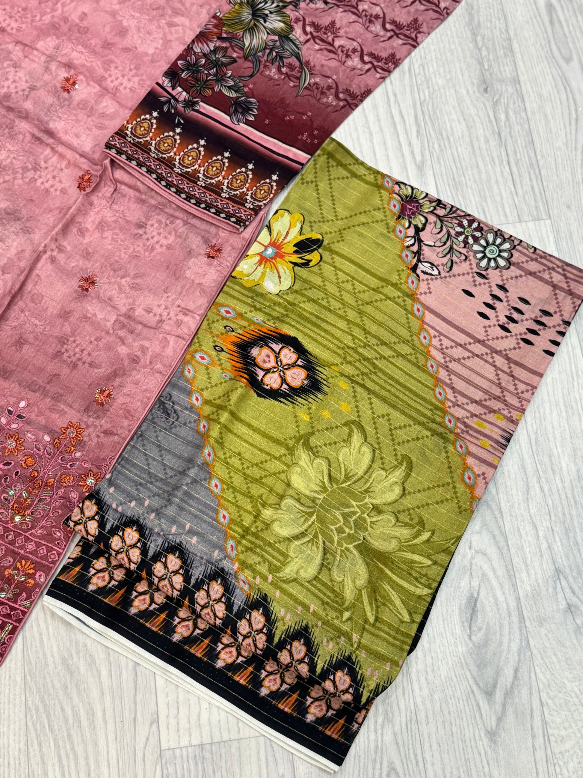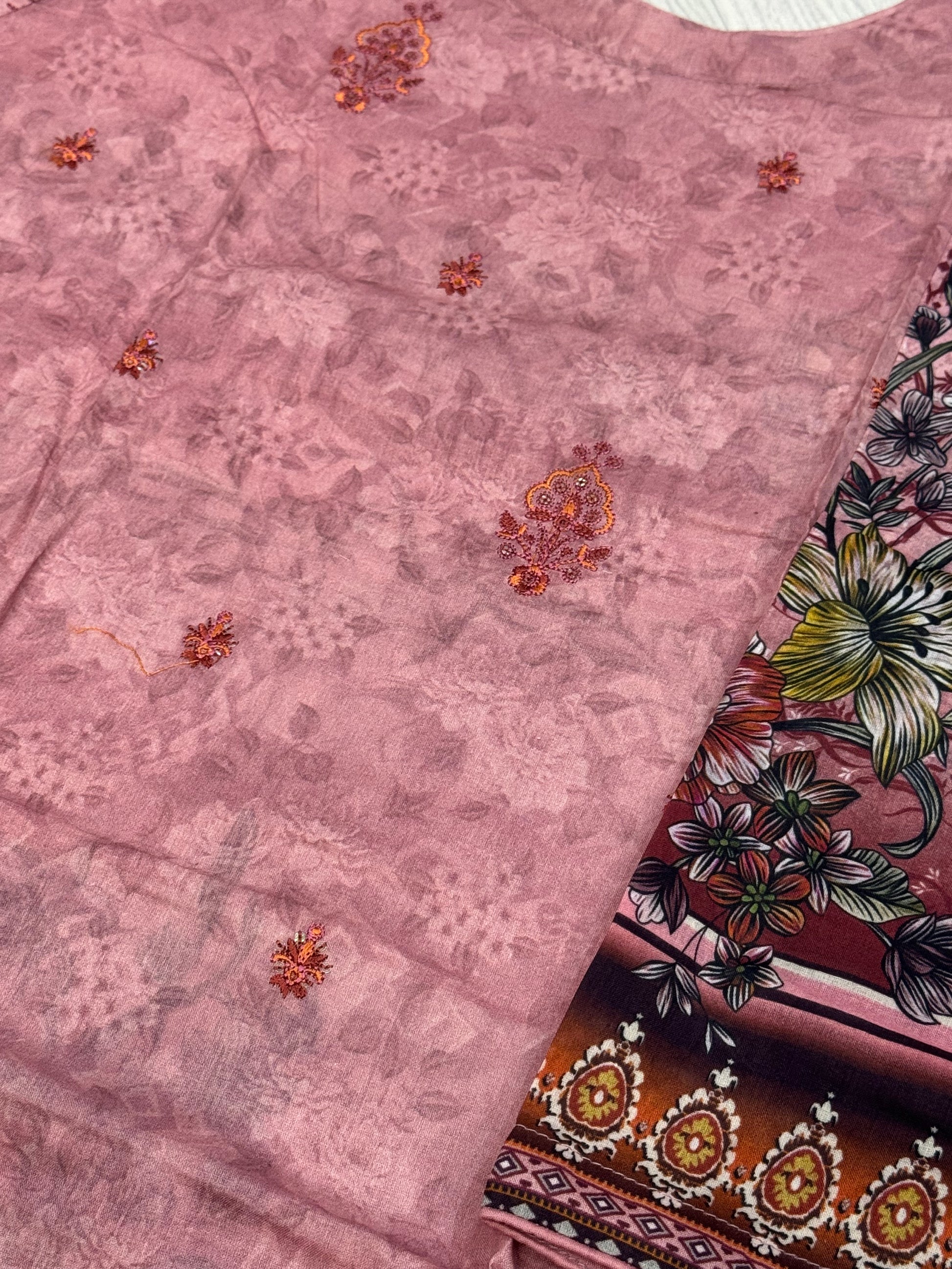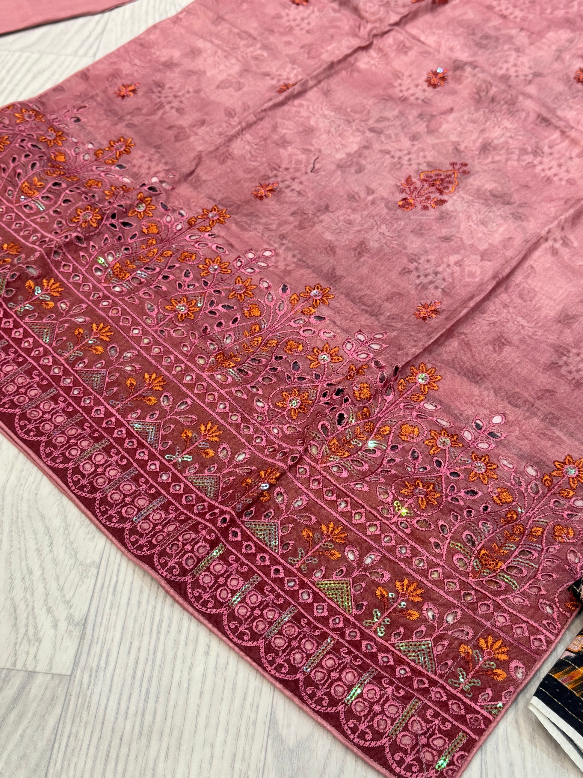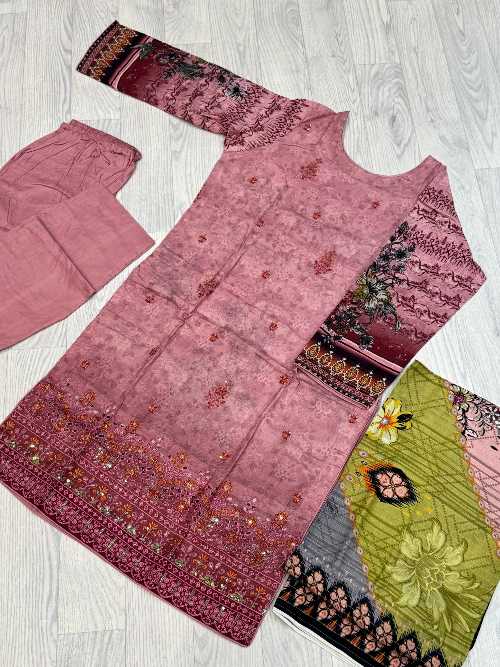 Dieses elegante 3-teilige Suit Set besteht aus Kameez, Hose und passender Schaal und ist die perfekte Wahl für warme Sommertage. Gefertigt aus hochwertigem Lawn-Material, überzeugt das Outfit durch seinen besonders dünnen, leichten und atmungsaktiven Stoff, der selbst bei hohen Temperaturen angenehm auf der Haut liegt.
