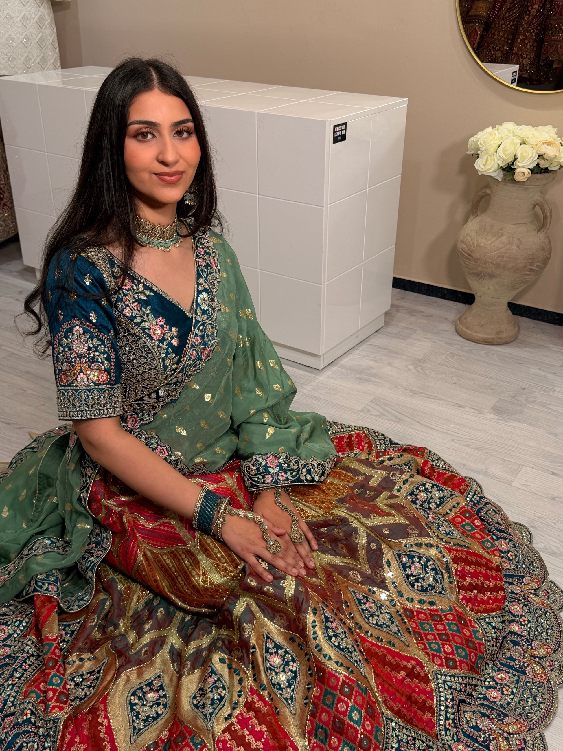 Gefertigt aus edler Banarasi Seide, überzeugt dieses Outfit durch seinen luxuriösen Glanz und seine hochwertige Struktur. Die detailreiche Zarkan Work (Stein- und Glitzerarbeit) verleiht dem Look eine majestätische Ausstrahlung – perfekt für Bräute und besondere Feierlichkeiten.