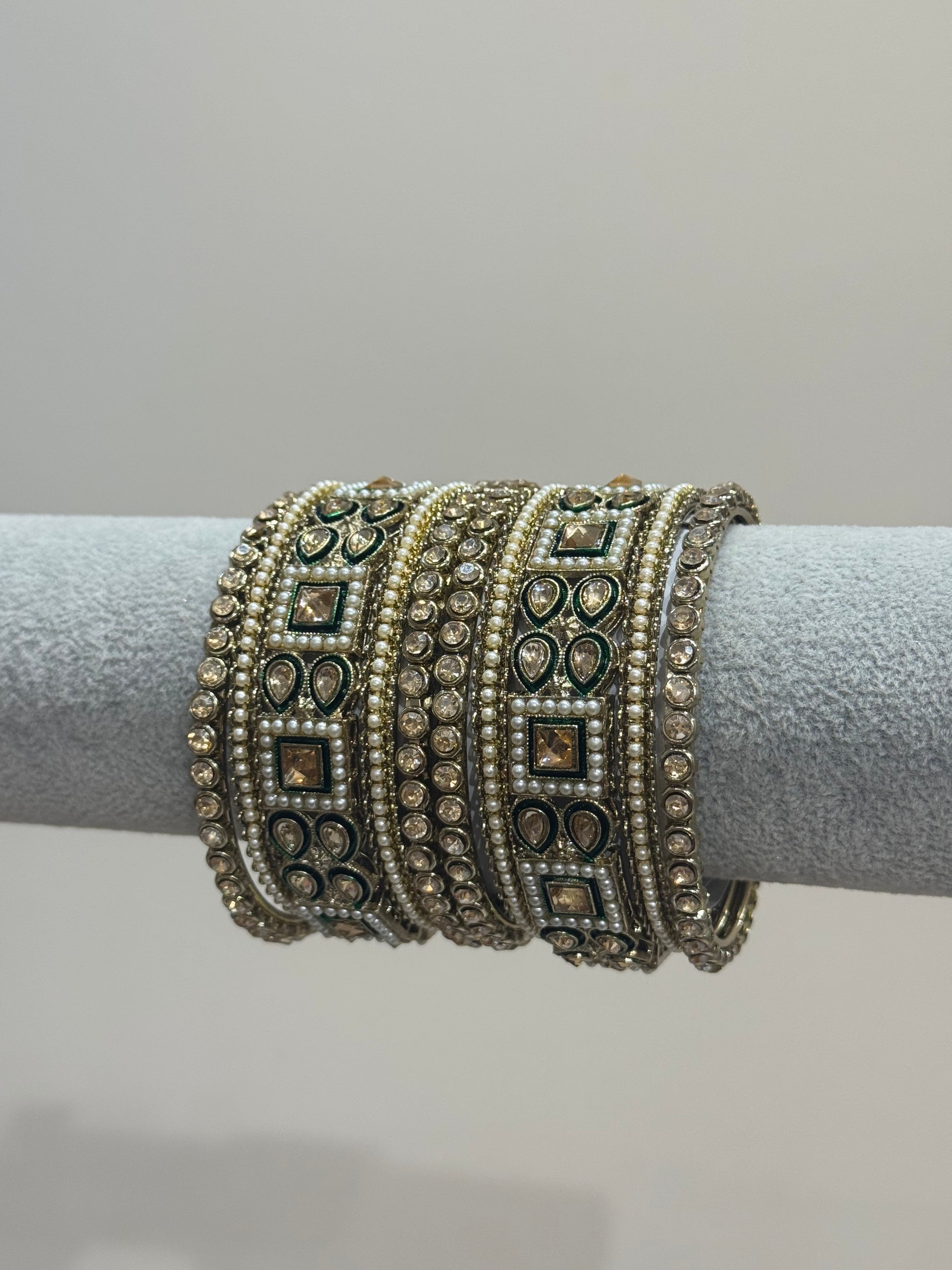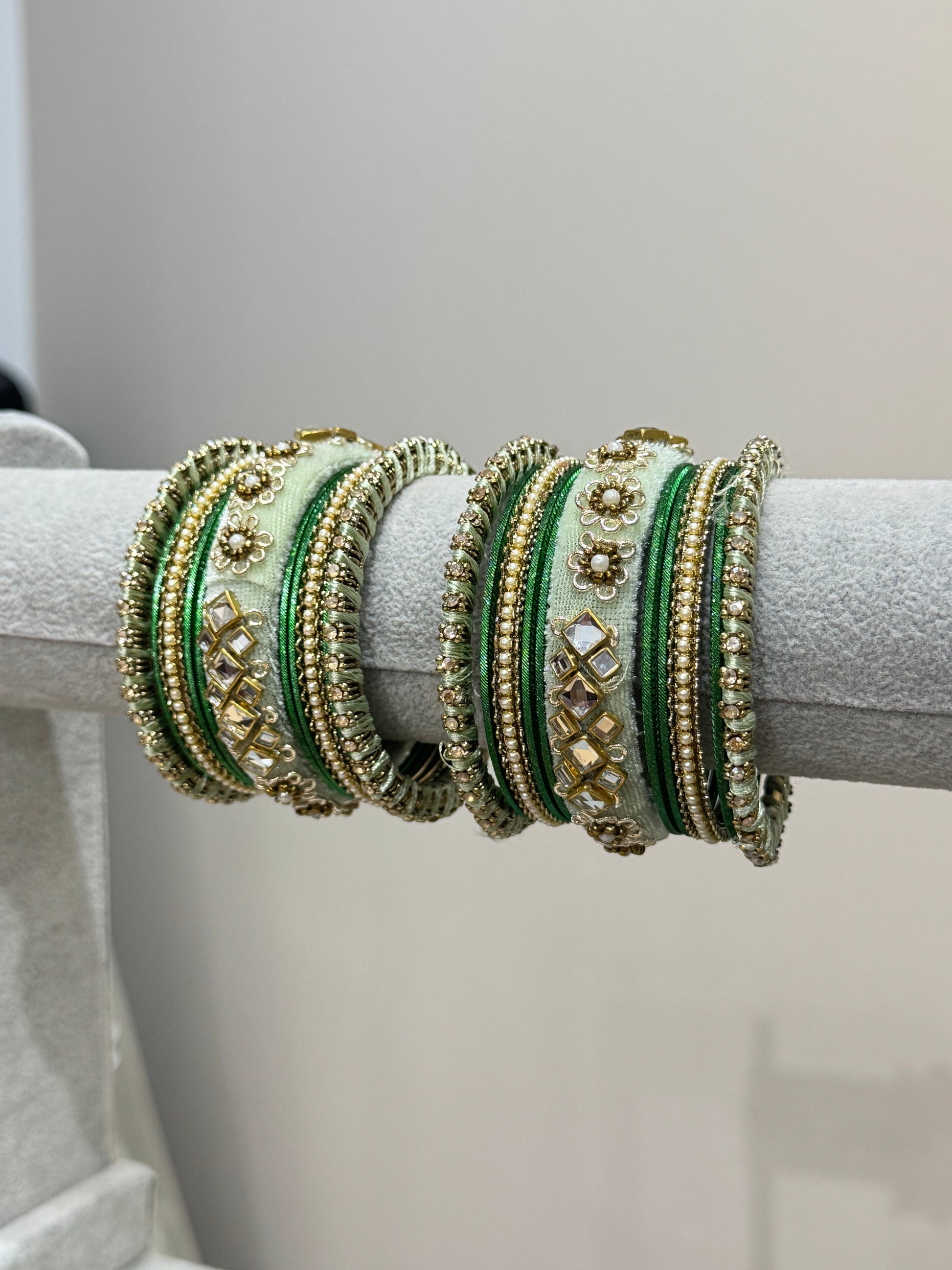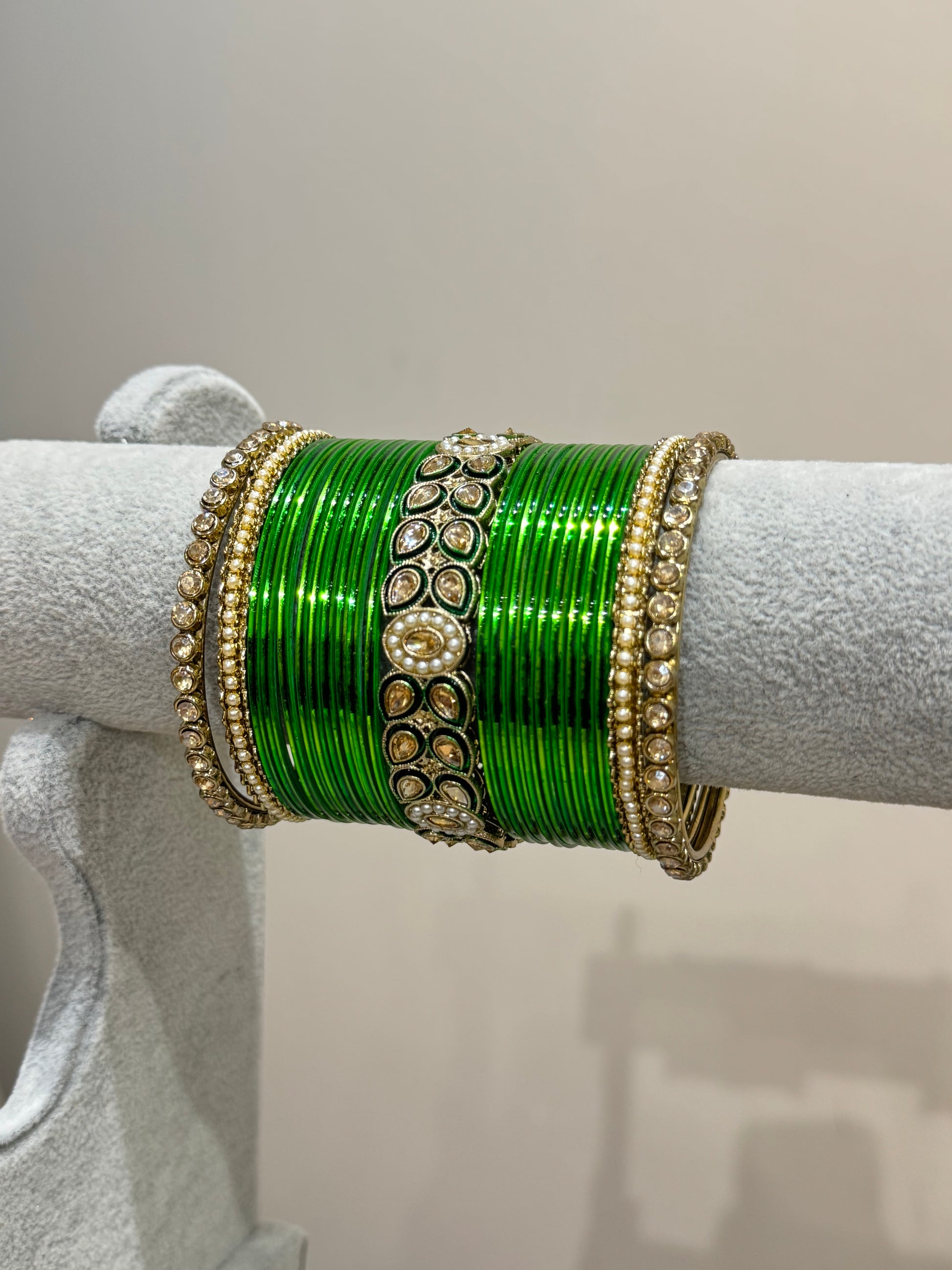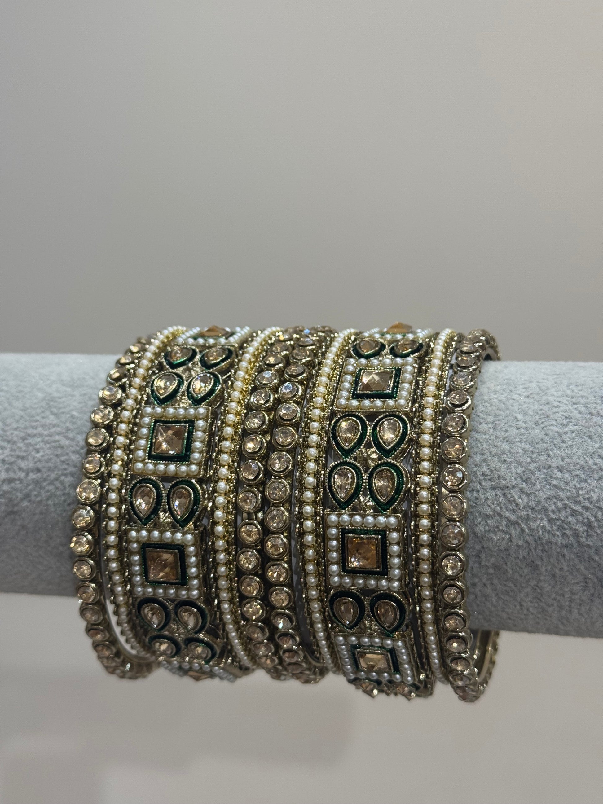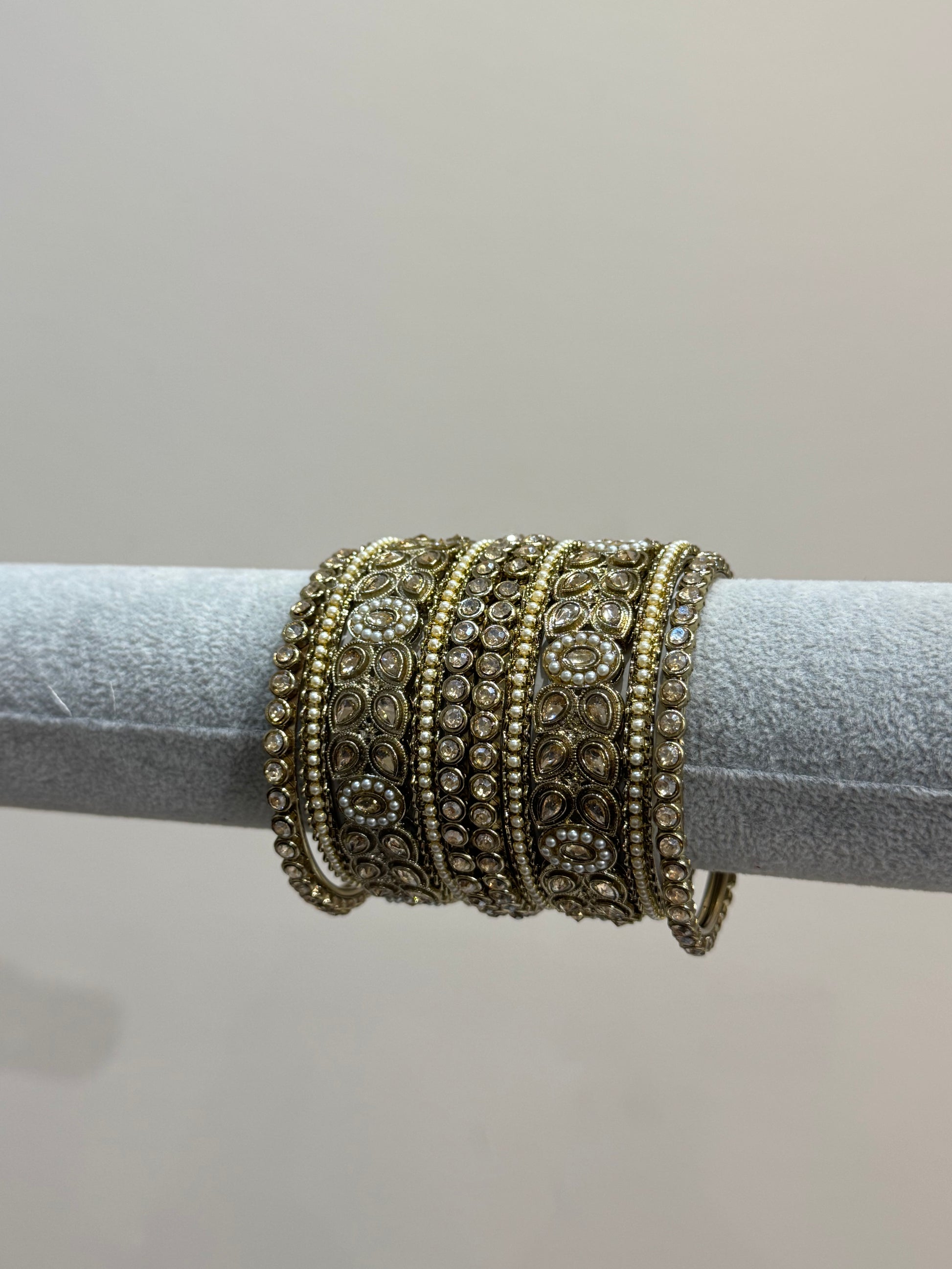 One set of bangles is one displayed until of bangles. Some photographs have 2 sets of bangles for presentation purposes. Unless specified otherwise, the price is for ONE set of of bangles only.