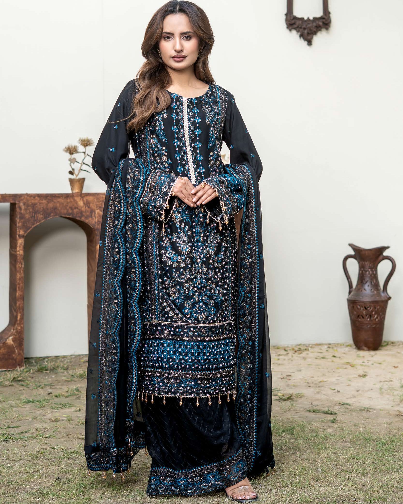 Das fein bestickte Kameez (Oberteil) ist reich verziert mit detaillierter Stickerei, die dem Design eine luxuriöse Ausstrahlung verleiht. Die kunstvollen Muster auf Vorderseite, Ärmeln und Saum unterstreichen den hochwertigen Charakter des Suits.