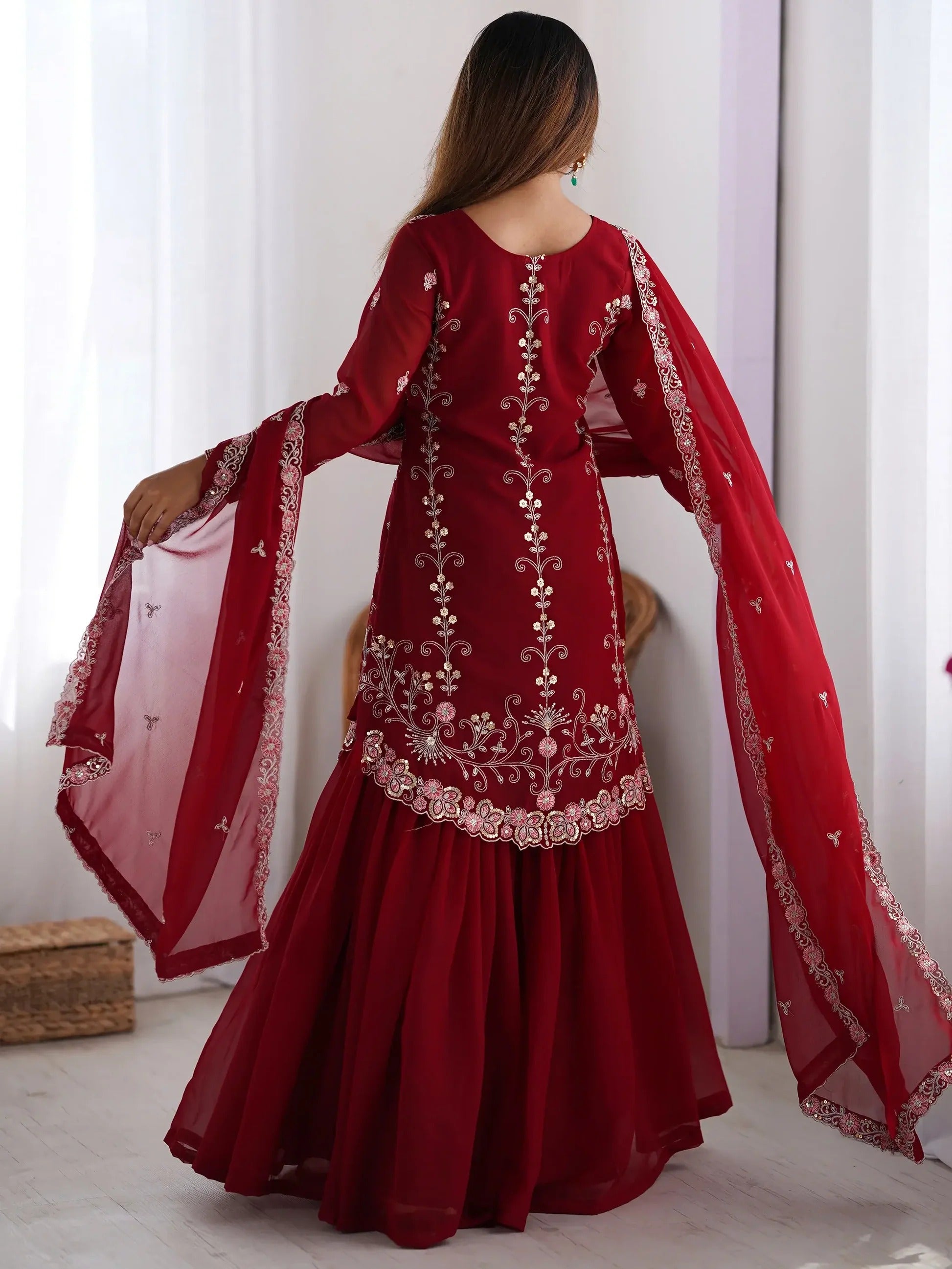 Dieses exquisite rote Sharara-Set aus hochwertigem Georgette begeistert mit feiner Fadenstickerei und glitzernder Paillettenarbeit, die pure Festlichkeit ausstrahlt. Der elegante Look ist ideal für Feiern, Hochzeiten und besondere Anlässe, bei denen du stilvoll glänzen möchtest.