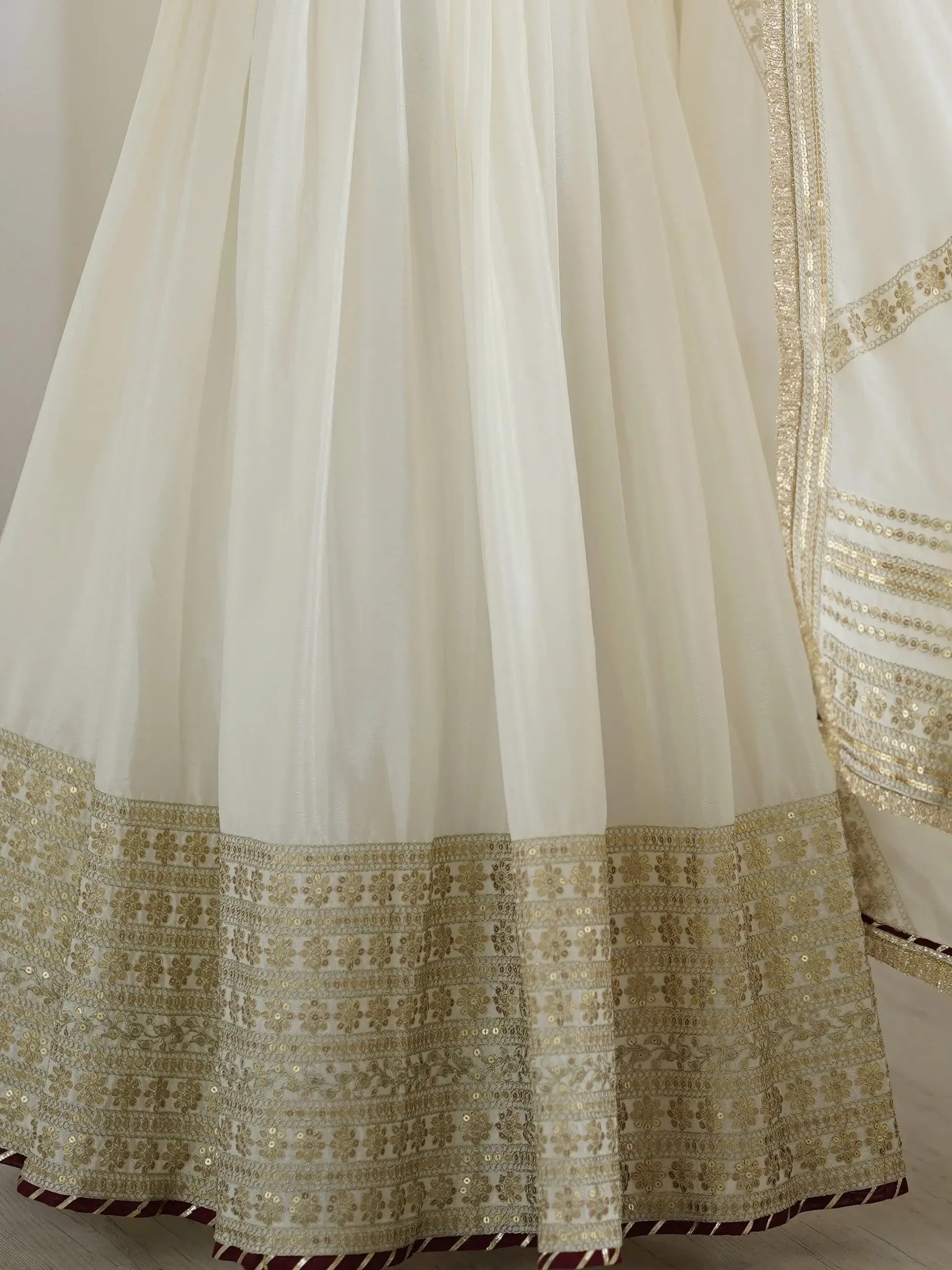 Dieses atemberaubende weiße Anarkali-Set aus luxuriöser Chinon-Seide verleiht deinem festlichen Auftritt eine edle, zeitlose Ausstrahlung. Die feine Pailletten- und Fadenstickerei entlang der Bordüre sorgt für glanzvolle Akzente und macht das Outfit ideal für Feste, Empfänge und besondere Anlässe.