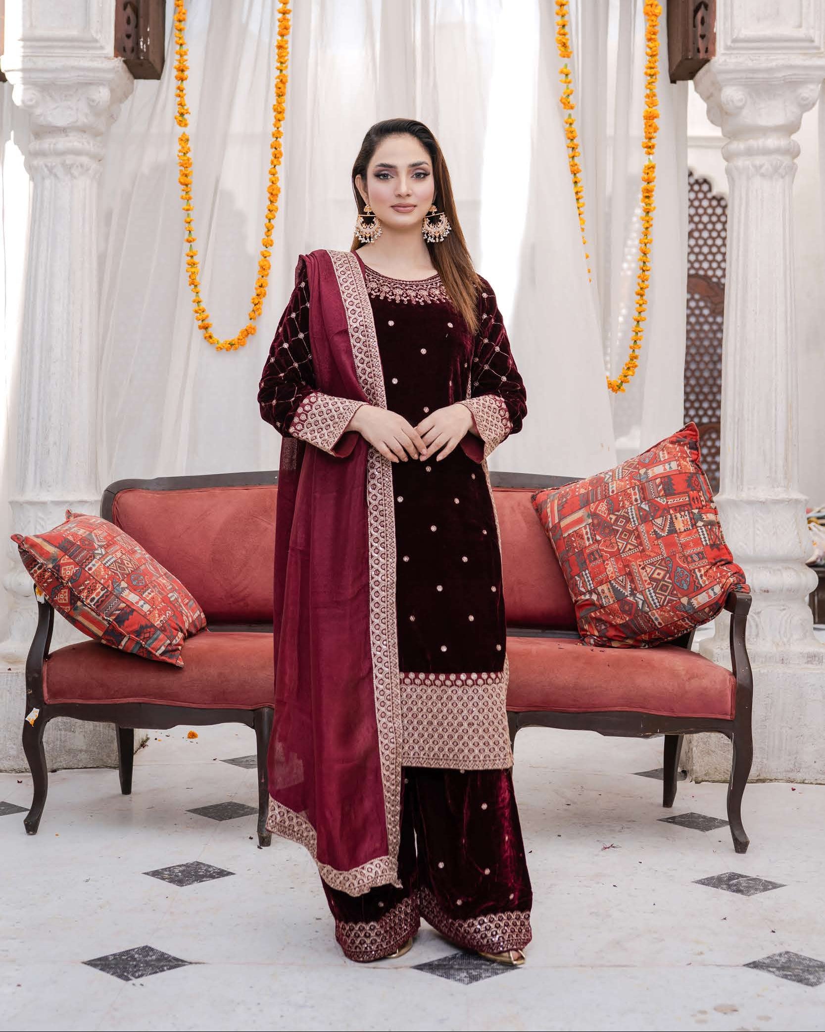 Dieser elegante festliche Velvet Suit für Damen steht für zeitlose Winter-Eleganz und luxuriösen Komfort. Das 3-teilige Designer-Set aus hochwertigem Velvet (Samt) besteht aus einem edel bestickten Kameez, einer passenden Hose und einer fein abgestimmten Dupatta – perfekt für kalte Tage und festliche Abende.