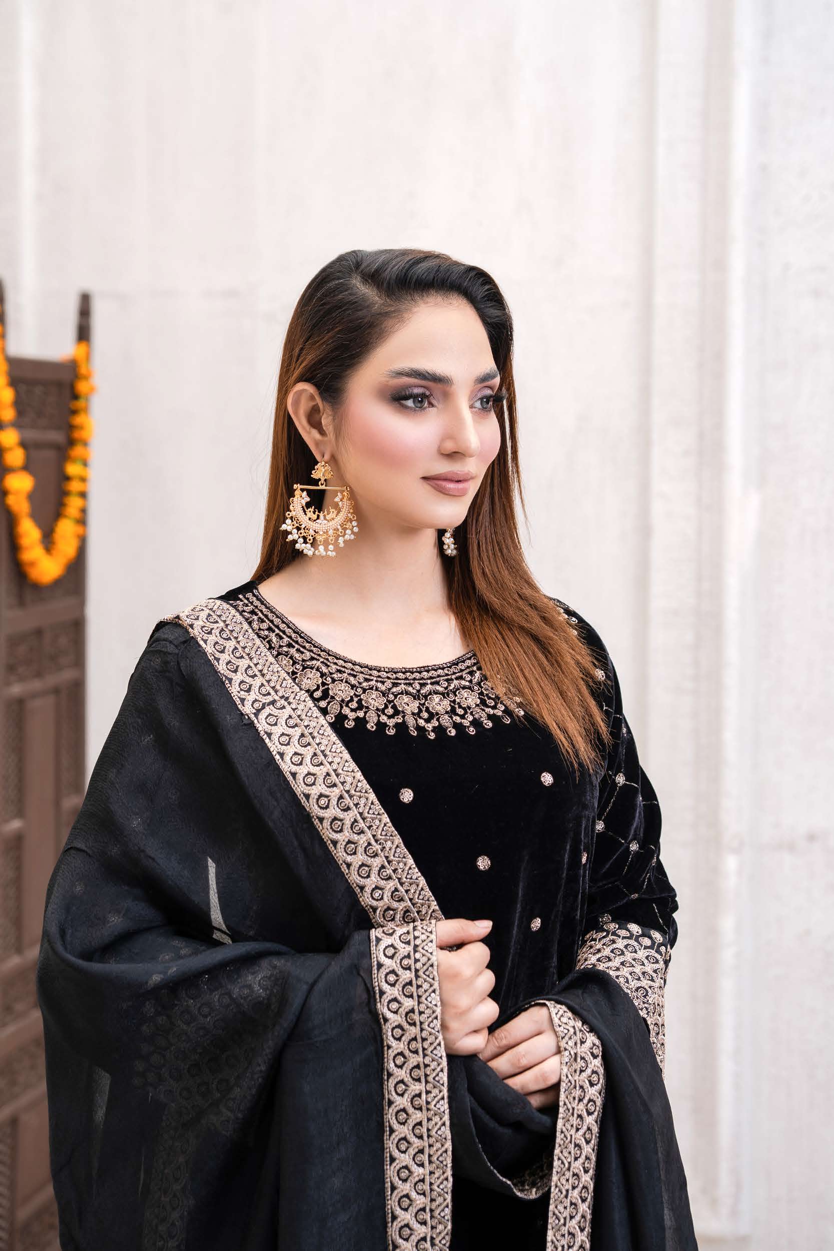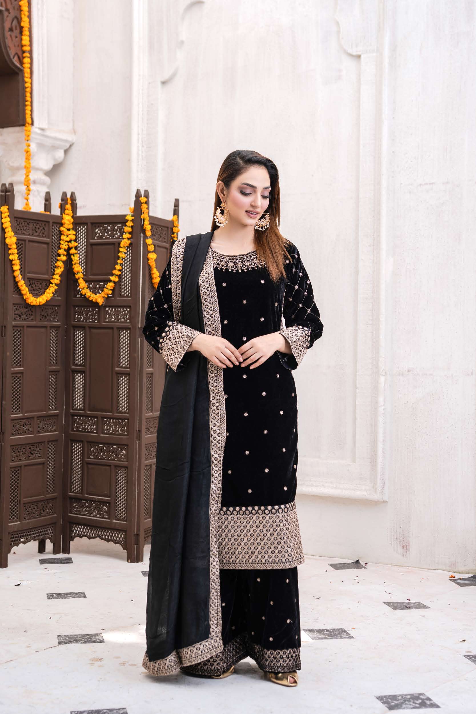 Dieser elegante festliche Velvet Suit für Damen steht für zeitlose Winter-Eleganz und luxuriösen Komfort. Das 3-teilige Designer-Set aus hochwertigem Velvet (Samt) besteht aus einem edel bestickten Kameez, einer passenden Hose und einer fein abgestimmten Dupatta – perfekt für kalte Tage und festliche Abende.