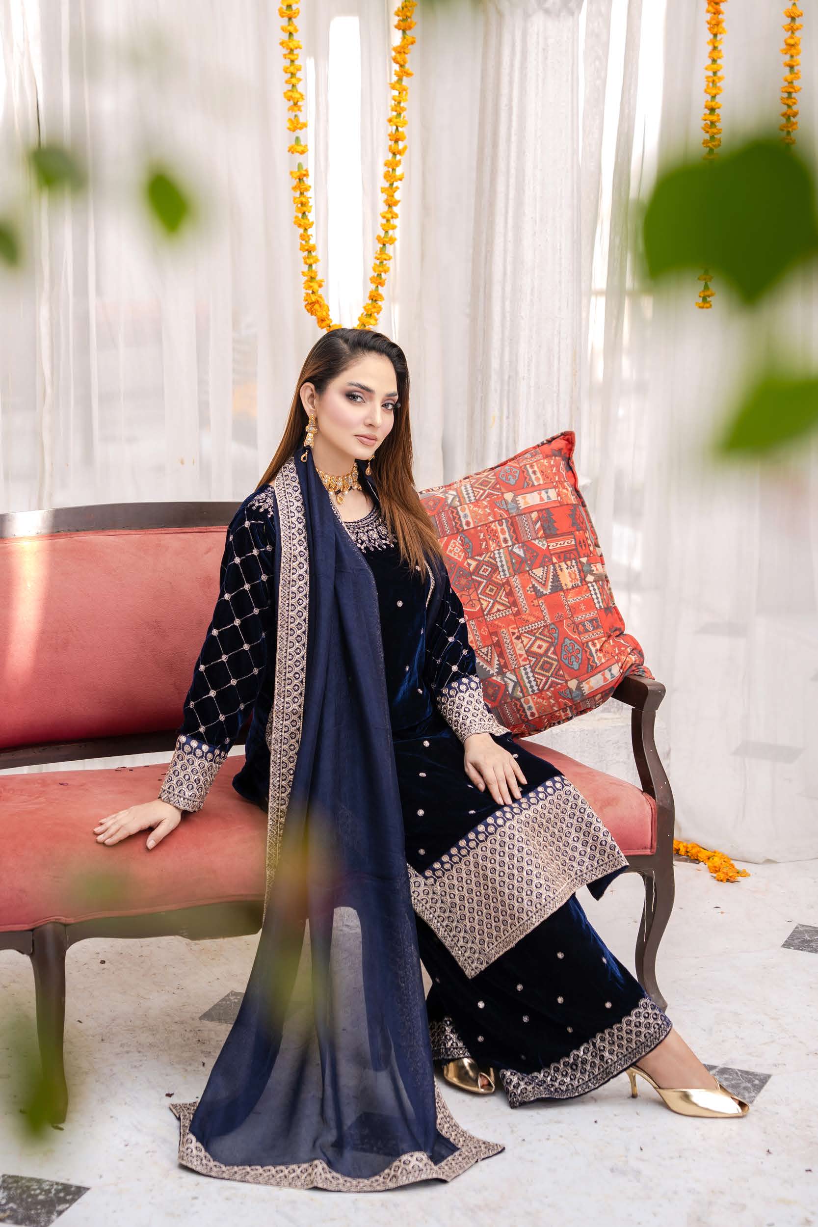 Dieser elegante festliche Velvet Suit für Damen steht für zeitlose Winter-Eleganz und luxuriösen Komfort. Das 3-teilige Designer-Set aus hochwertigem Velvet (Samt) besteht aus einem edel bestickten Kameez, einer passenden Hose und einer fein abgestimmten Dupatta – perfekt für kalte Tage und festliche Abende.
