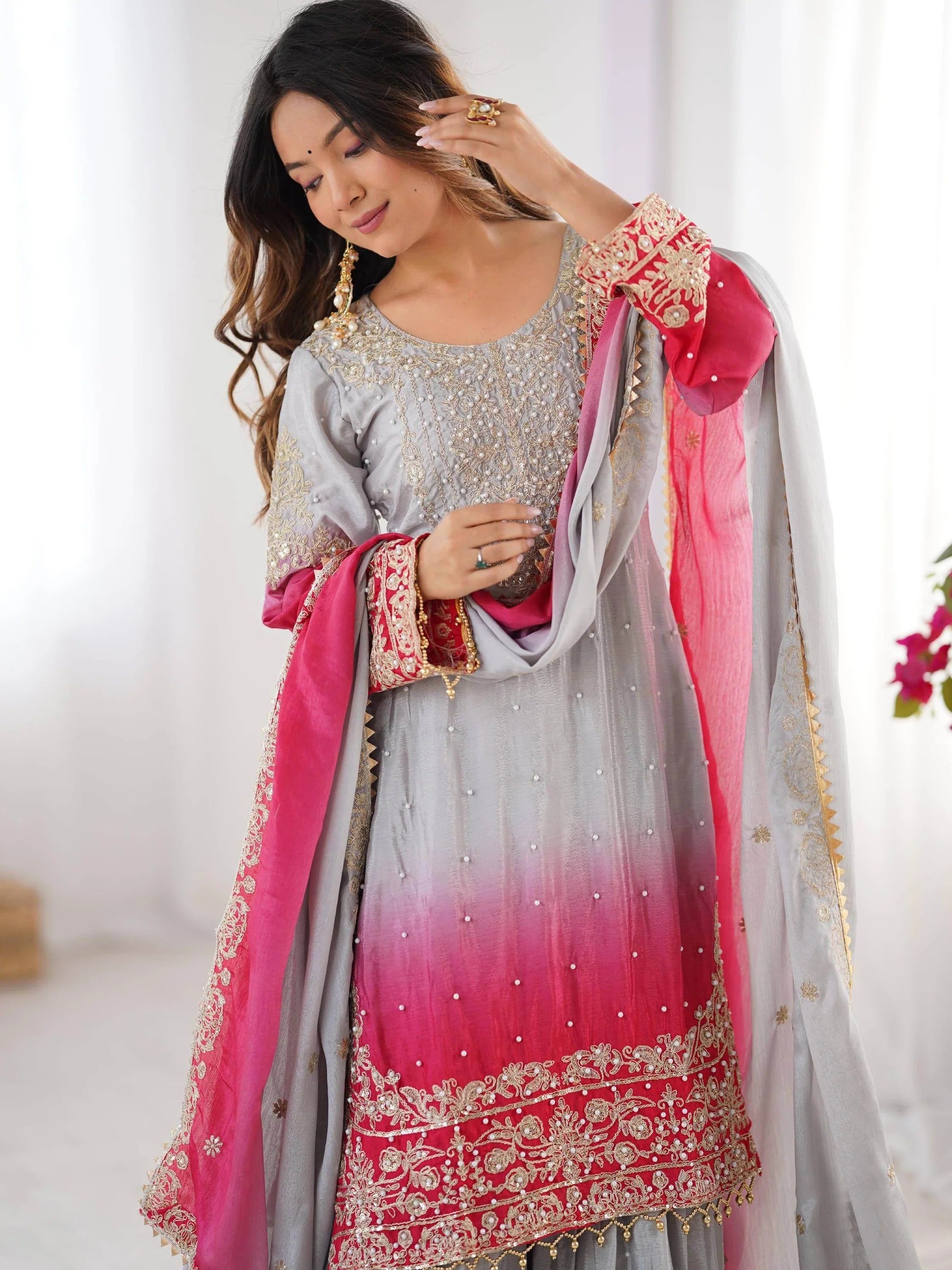 Grey Pearl Work Festive Wear Chinon Sharara Suit