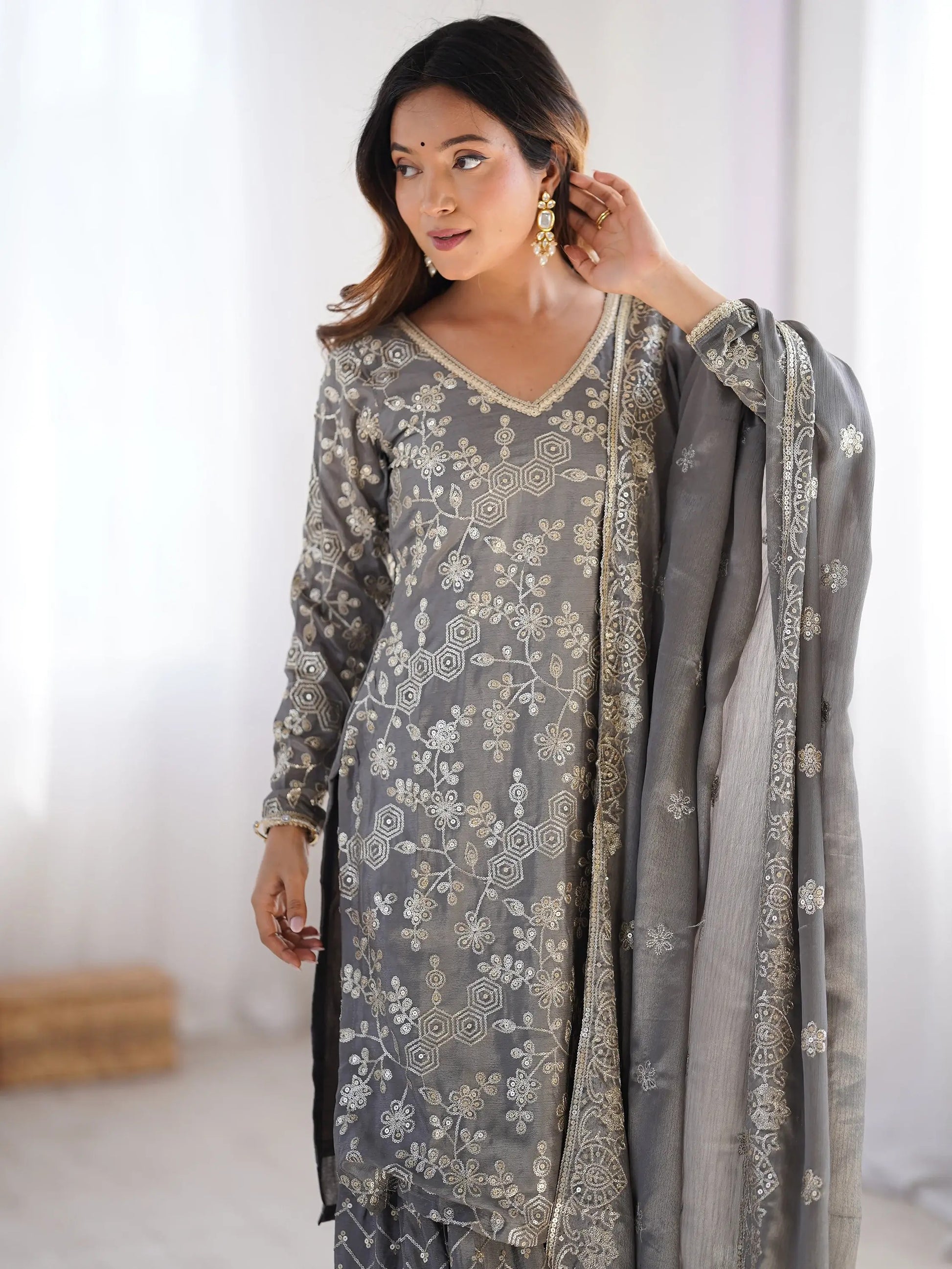 Grey Sequins Chinon Sharara Suit With Dupatta