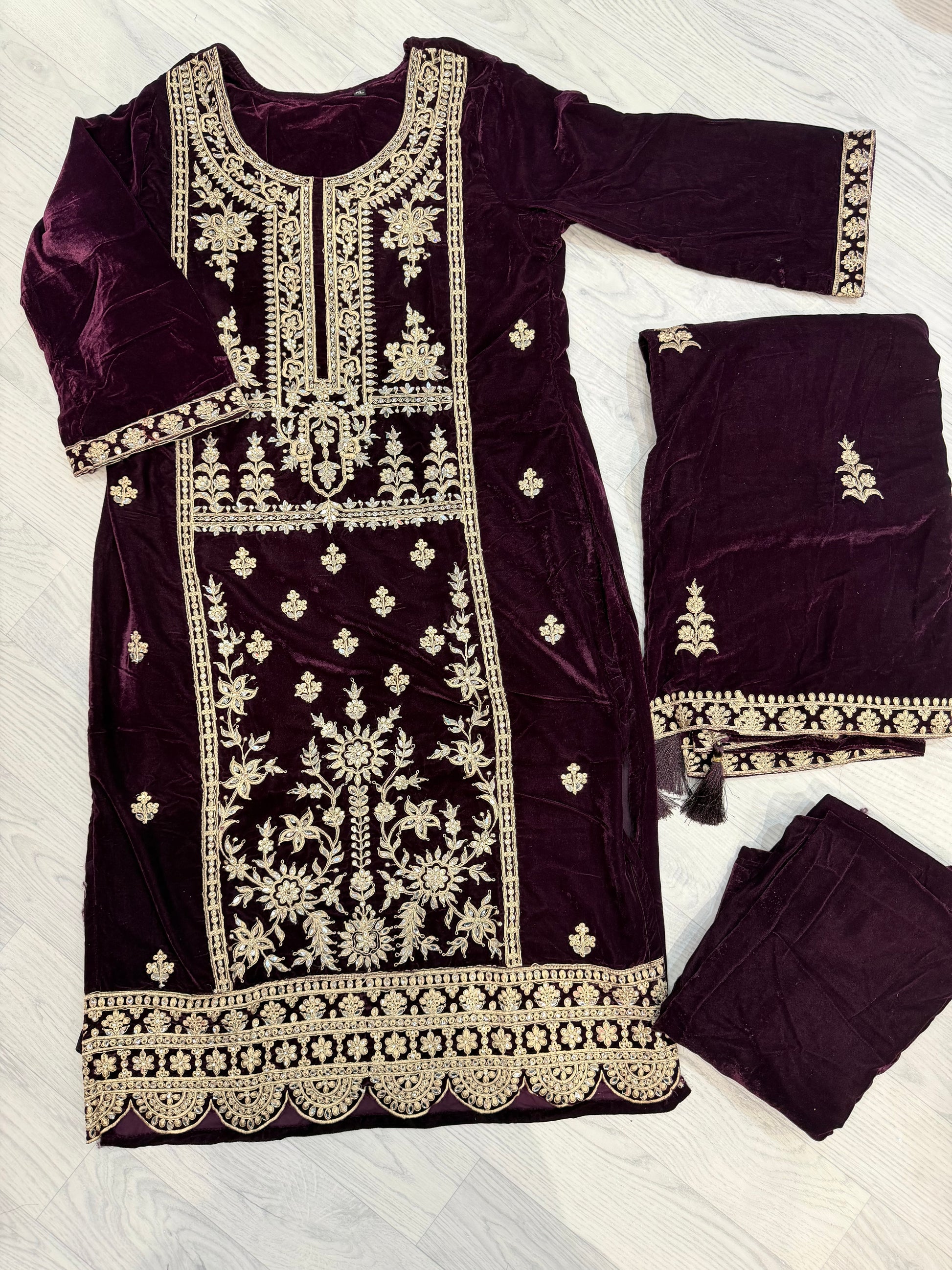Erlebe zeitlose Eleganz mit diesem exklusiven 3-teiligen Velvet Suit Set, ideal für Festtage, Winterhochzeiten und besondere Anlässe. Das Outfit besteht aus einem geraden Kurta, einer passenden Hose und einem koordinierten Dupatta, die zusammen ein harmonisches, edles Gesamtbild ergeben.