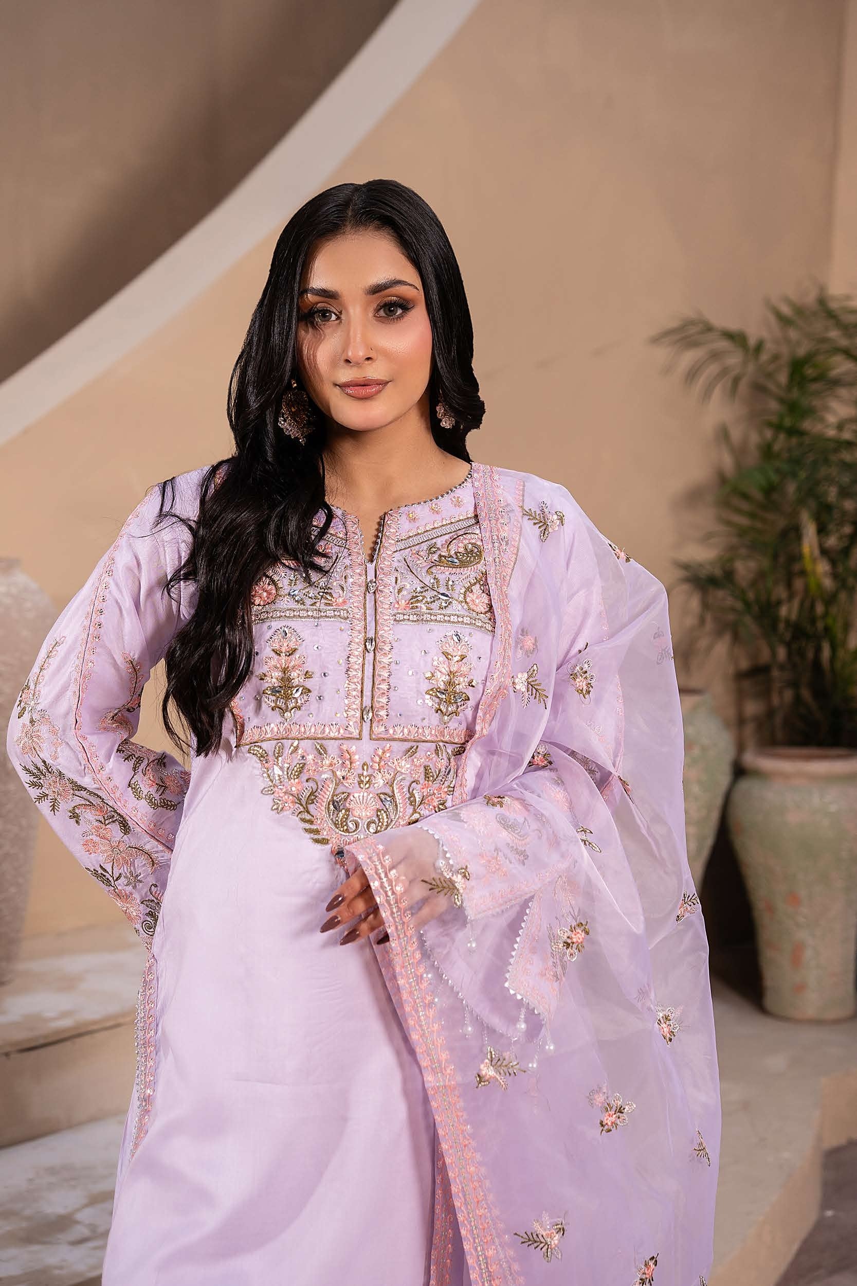 Dieses Ensemble besticht durch seine aufwendigen floralen Stickereien, die dem Look eine royale Note verleihen. Die präzisen Details am Dekolleté und den Ärmelabschlüssen machen jedes Stück zu einem kleinen Kunstwerk.