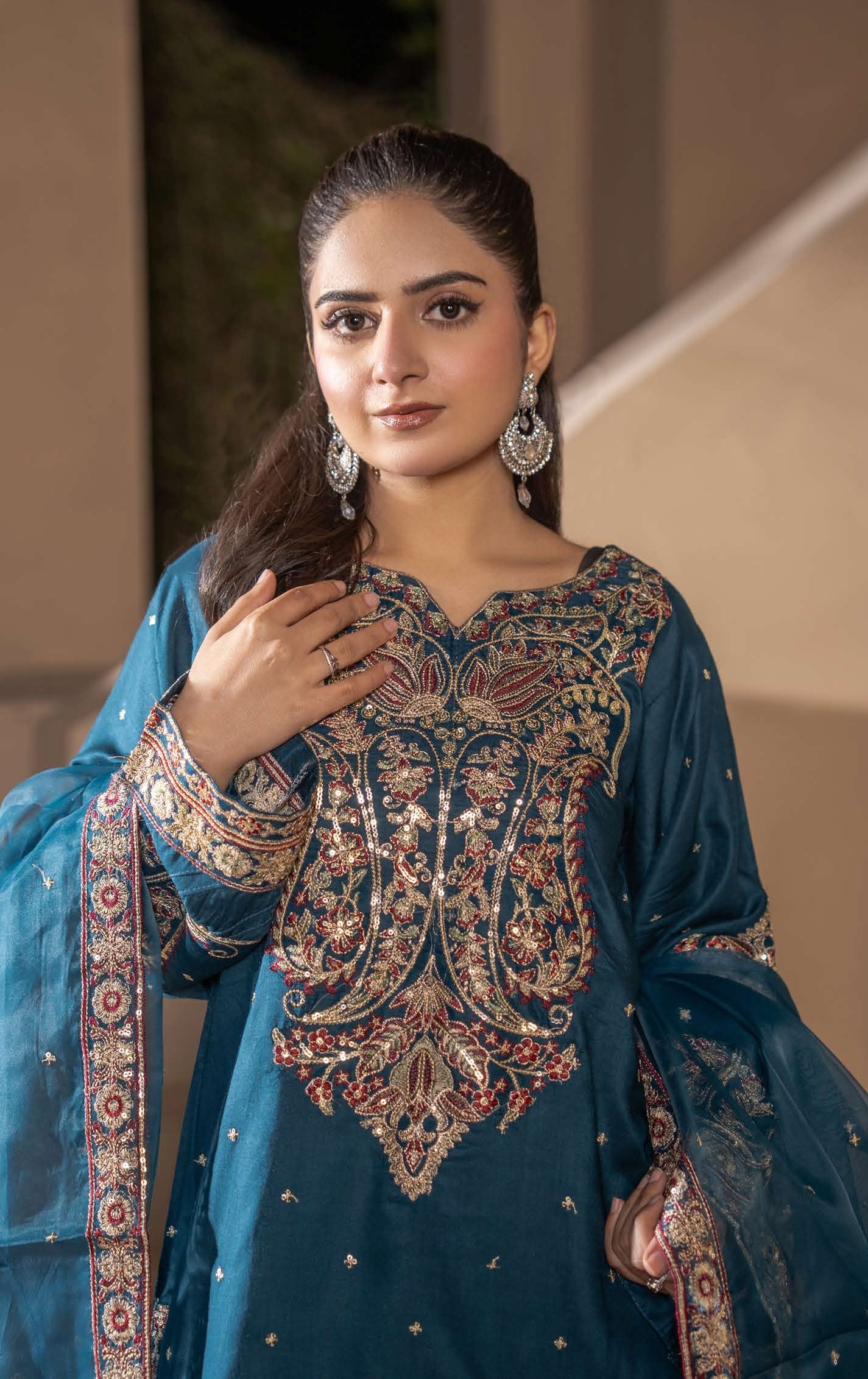Dieses Ensemble besticht durch seine aufwendigen floralen Stickereien, die dem Look eine royale Note verleihen. Die präzisen Details am Dekolleté und den Ärmelabschlüssen machen jedes Stück zu einem kleinen Kunstwerk.