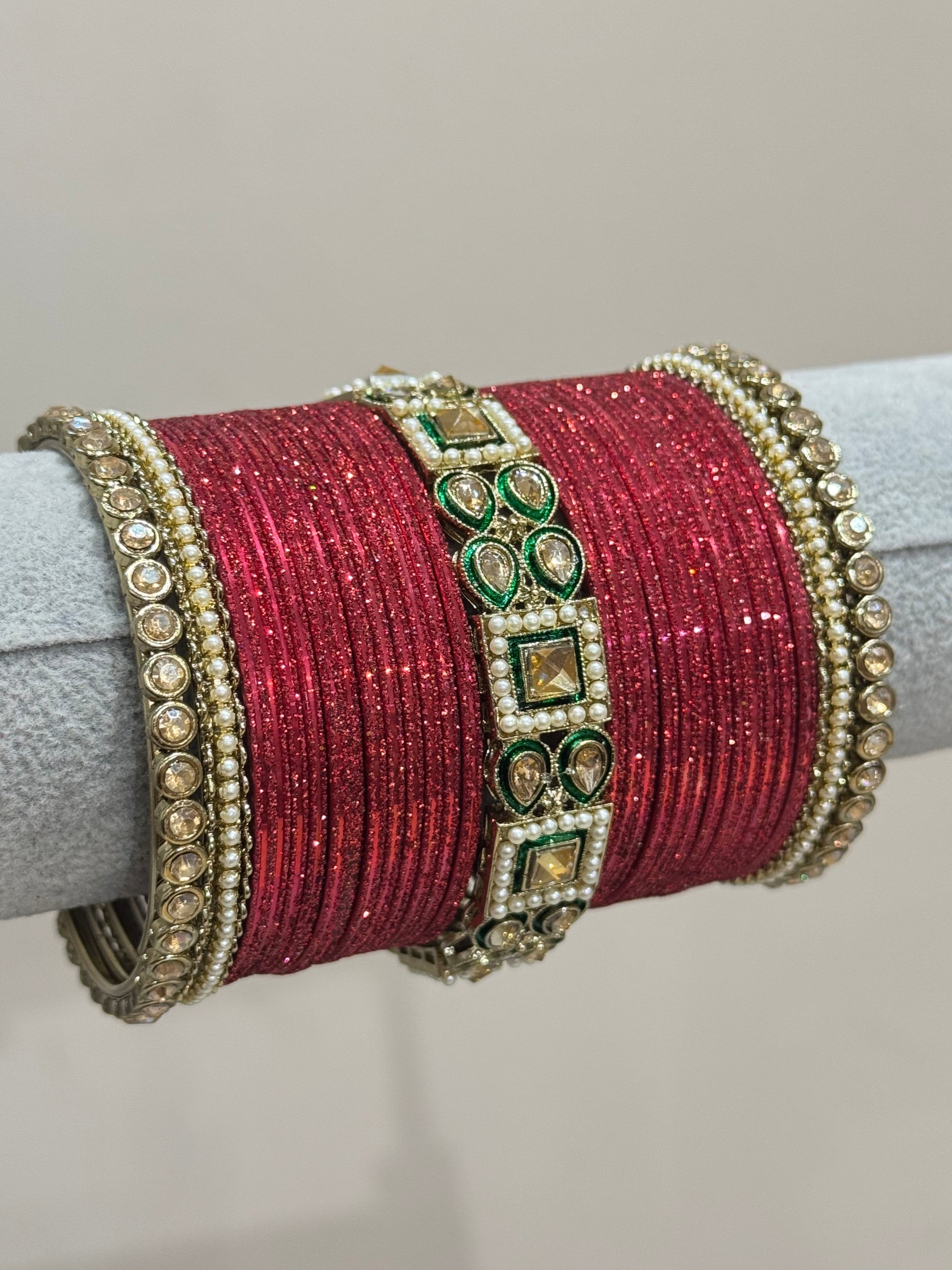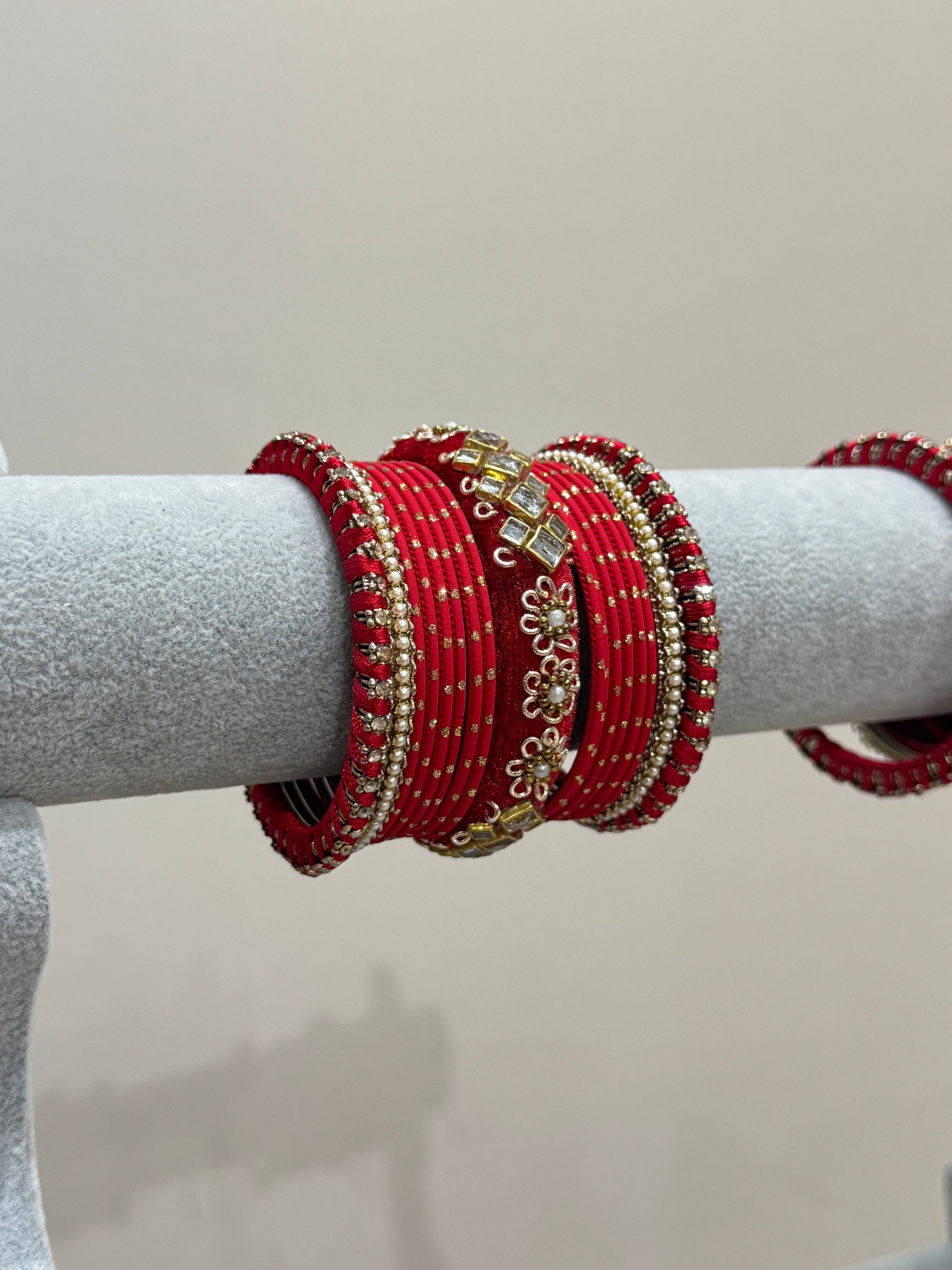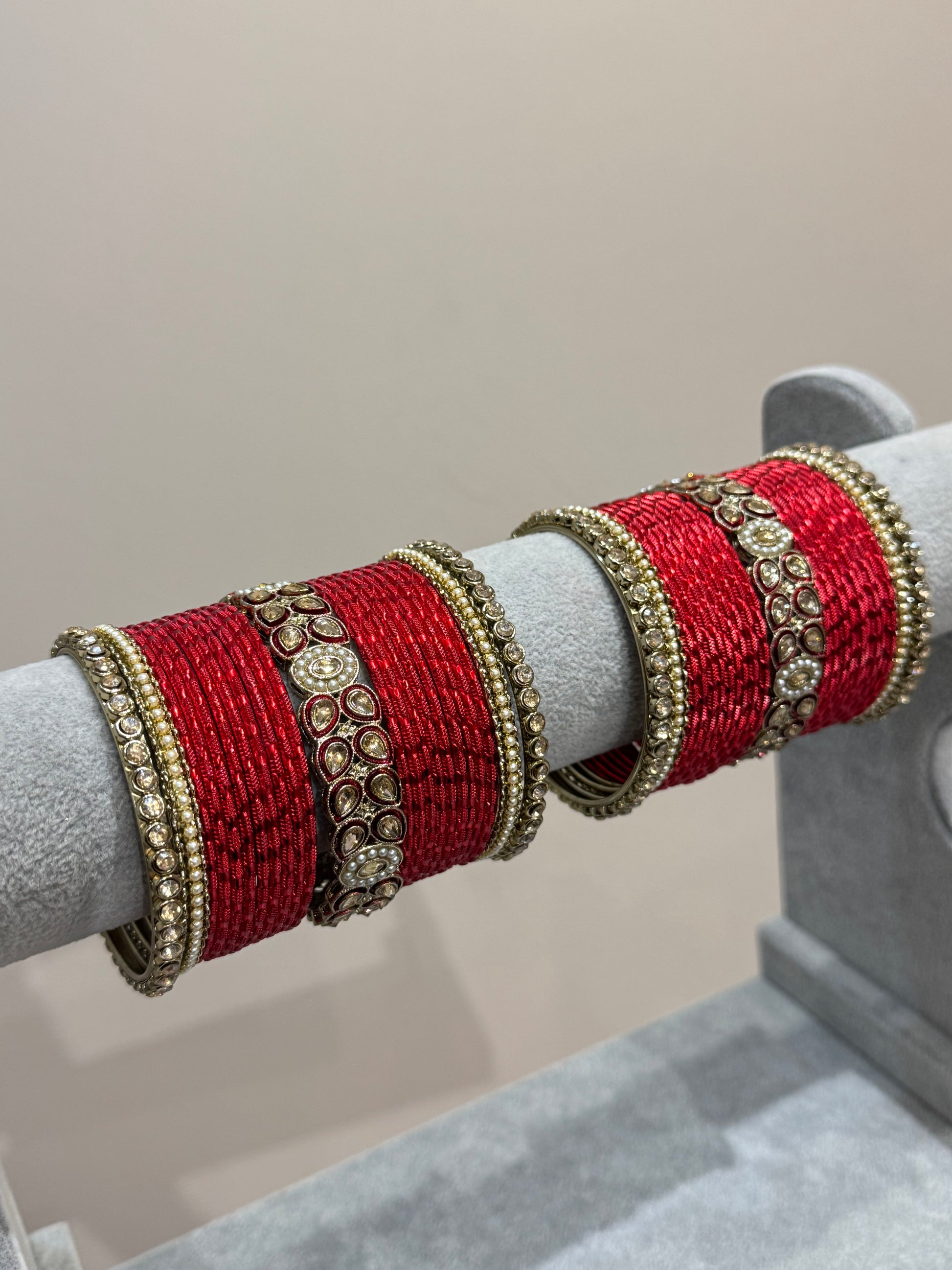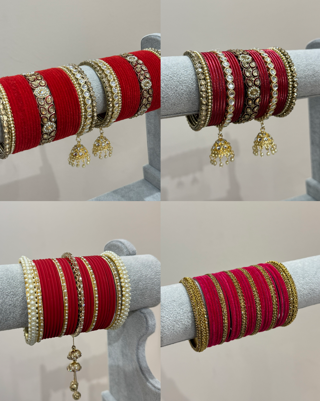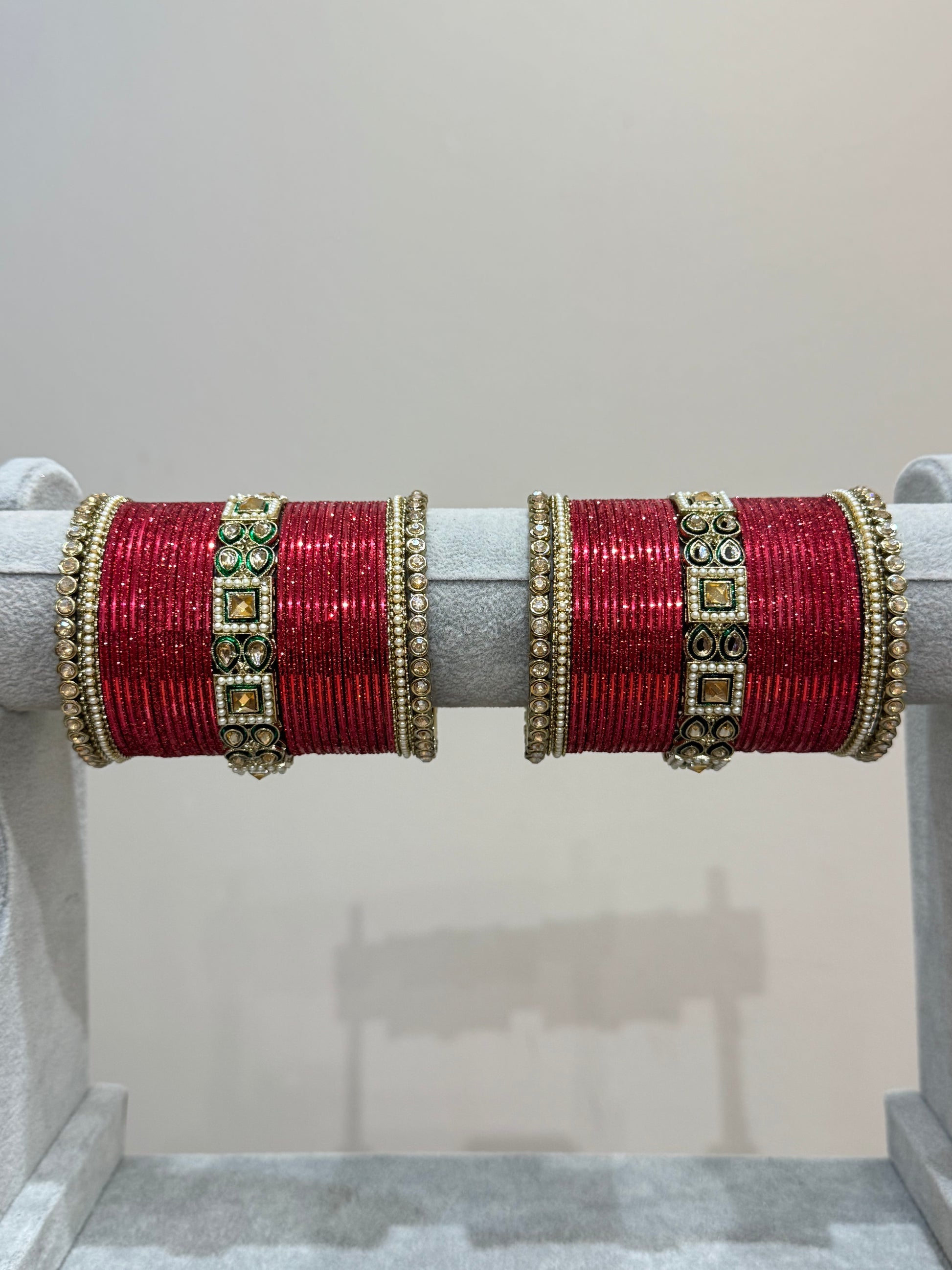 One set of bangles is one displayed until of bangles. Some photographs have 2 sets of bangles for presentation purposes. Unless specified otherwise, the price is for ONE set of of bangles only.