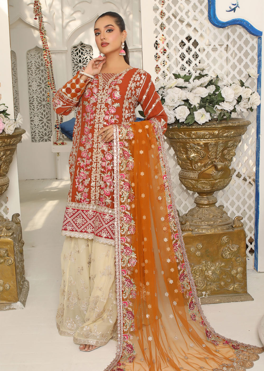 This suit is made of soft embroidered chiffon, paired with a gharara and matching embroidered chiffon scarf.