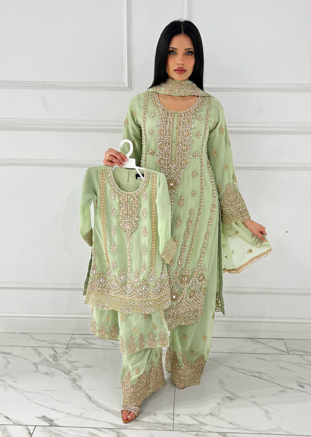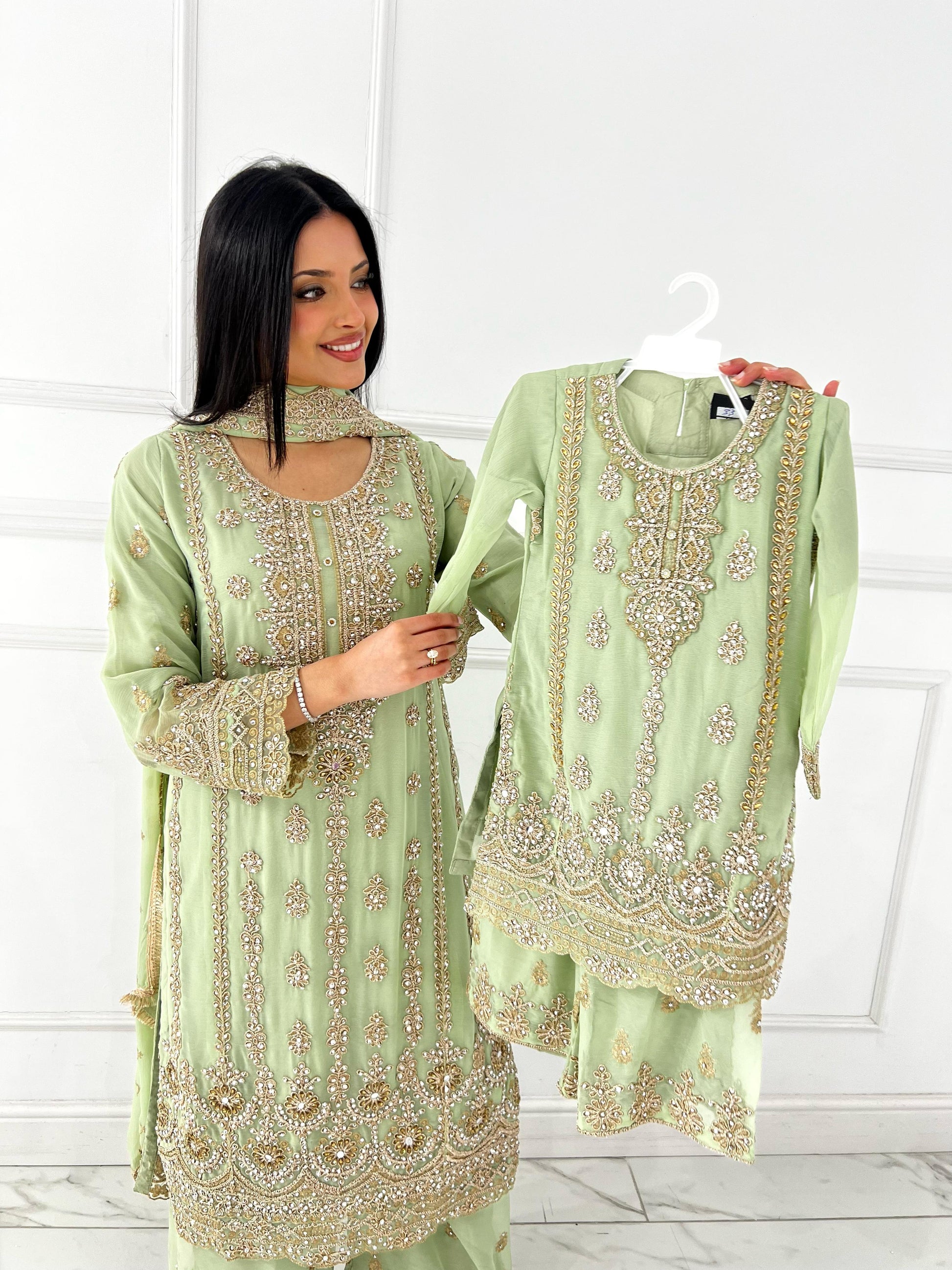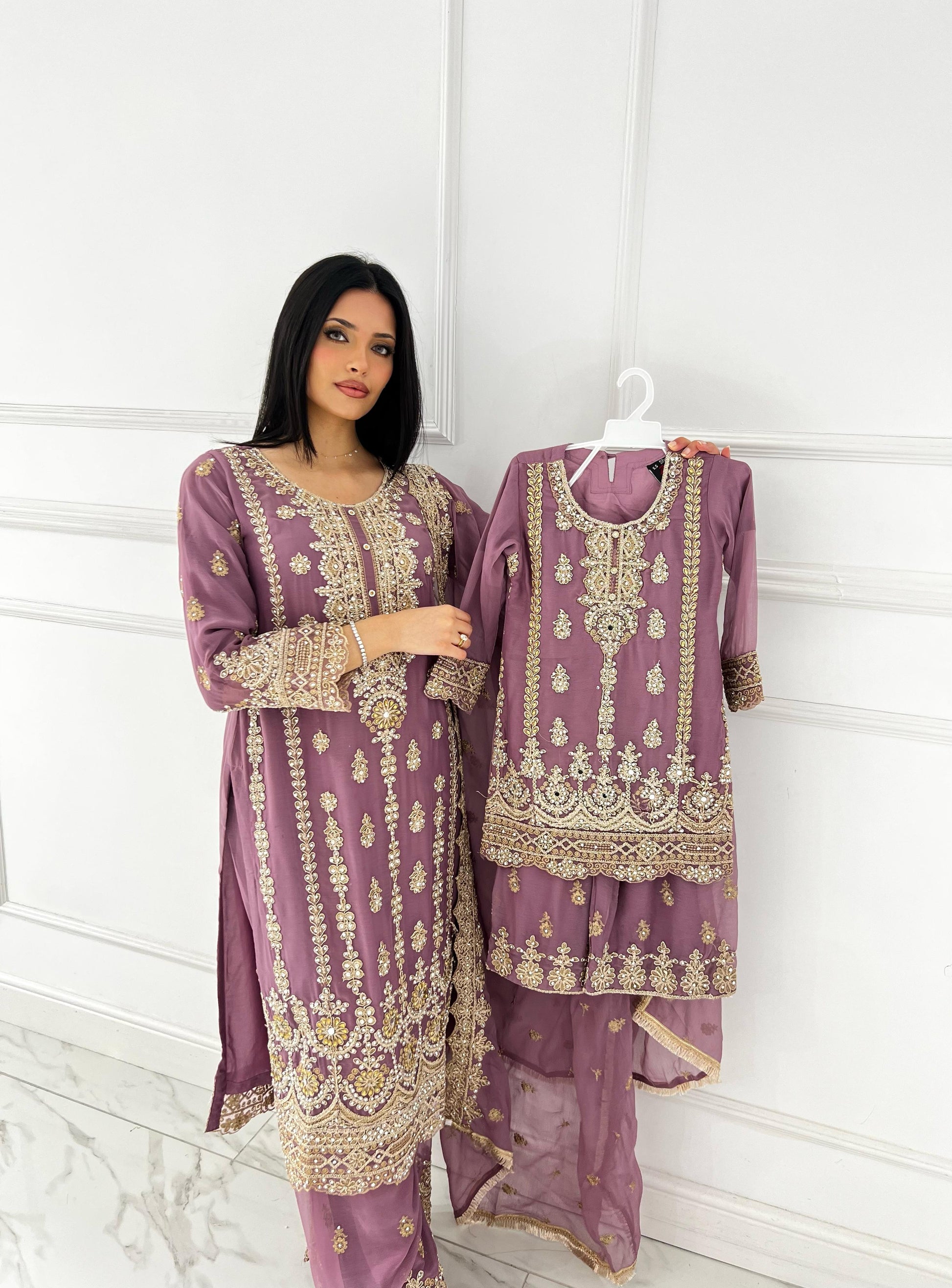 Experience the joy of matching outfits with your little one in our New Chiffon Embroidered Mummy n Me Outfit. Made with lightweight chiffon and adorned with intricate ghotta work, this stunning outfit will make you and your child stand out in any gathering. Perfect for creating unforgettable memories together!