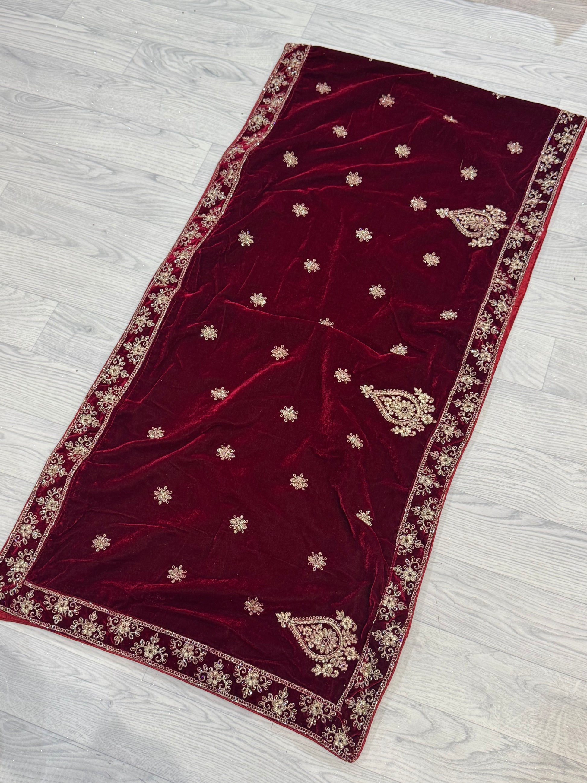 Dunkel rotes Tuch/Schal aus Samtstoff mit Stickerei.
