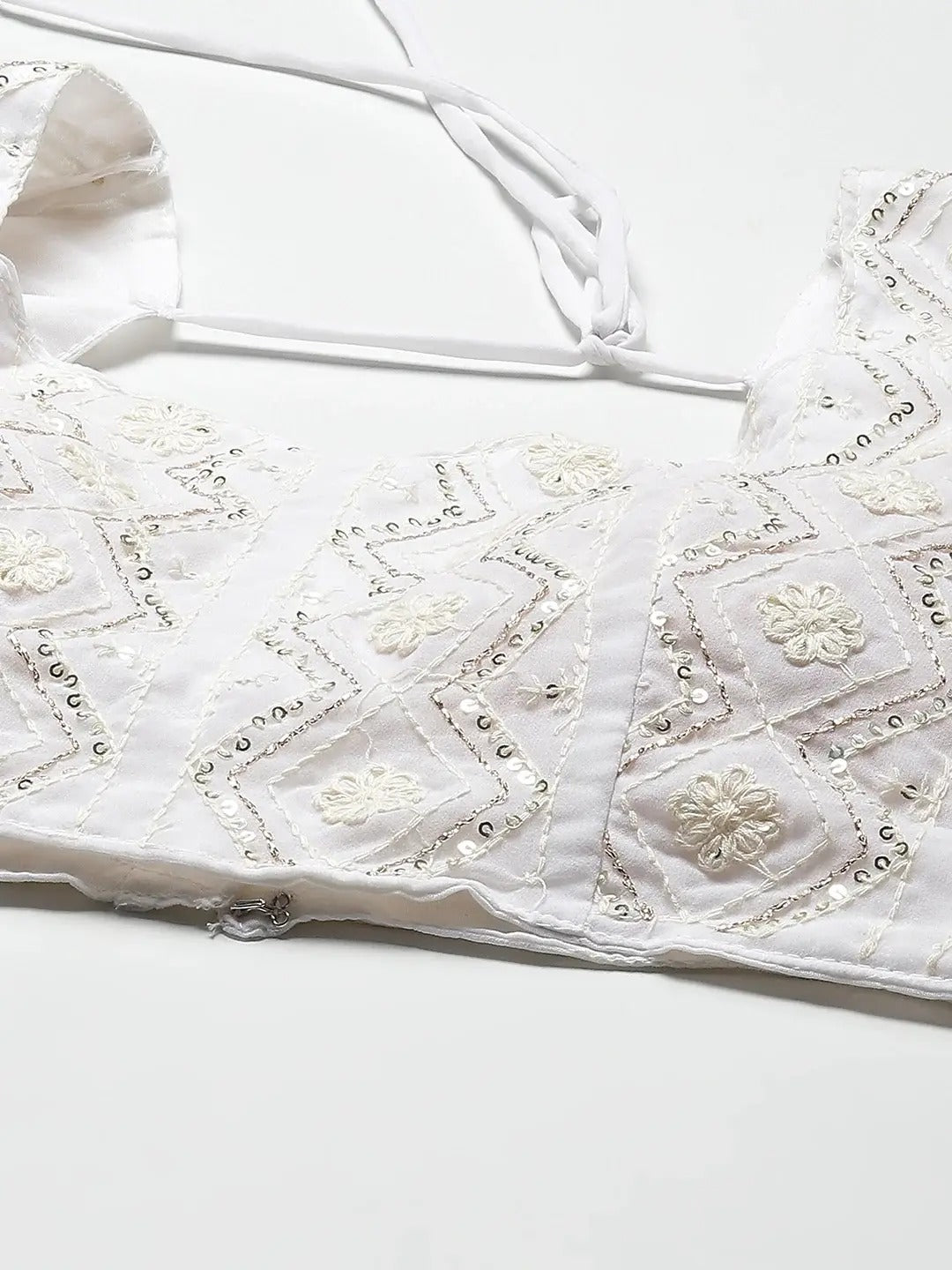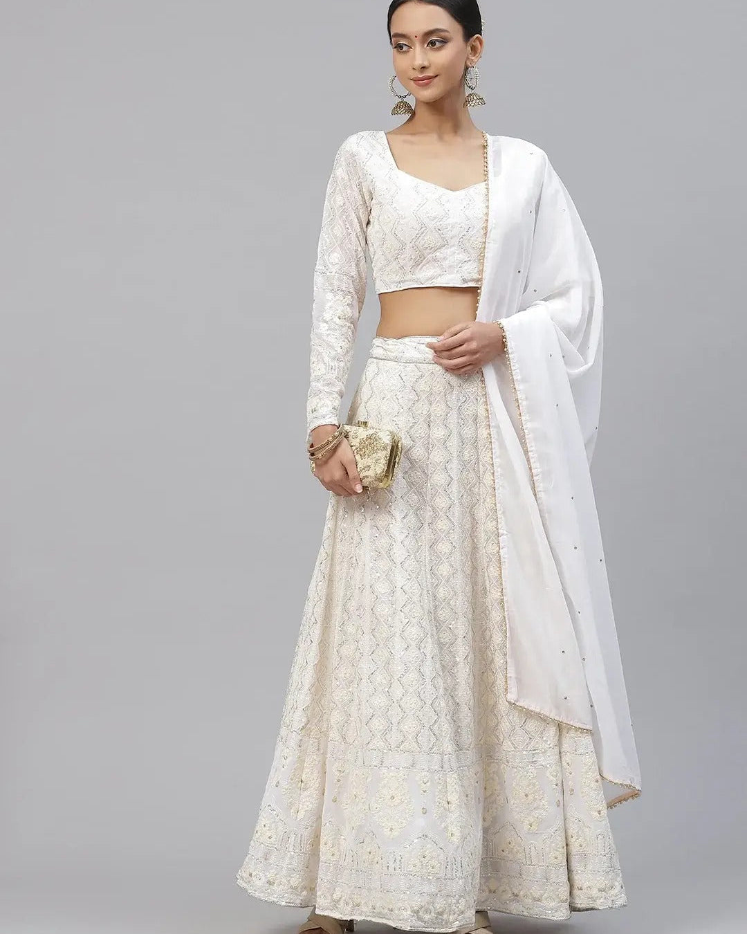 Dieses wunderschöne weiße Georgette Lehenga Set überzeugt durch feine Thread- und Paillettenstickereien, die dem Outfit eine edle und zugleich feminine Ausstrahlung verleihen. Perfekt abgestimmt wird der Look durch die passende Georgette Dupatta mit identischer, detailreicher Stickarbeit – ein harmonisches Ensemble für Hochzeiten und Bridesmaid-Auftritte.